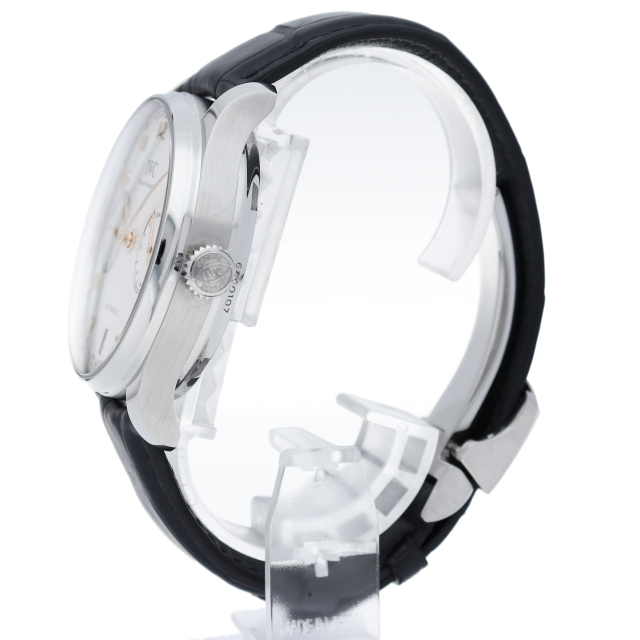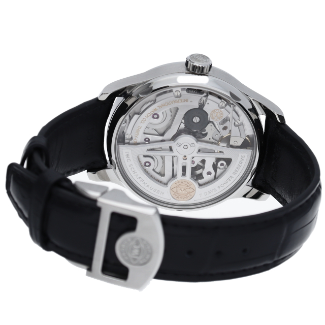 懐中時計をルーツとした大型ムーブメント搭載のコレクションがポルトギーゼです。クラシックな雰囲気を演出した、文字盤外周のレールウェイ、リーフ針、アップライトのインデックスは1930年代に製作されたポルトギーゼをモチーフとしています。ムーブメントはセラミック素材を多用したペラトン自動巻き機構のムーブメント・キャリバー52010を搭載。