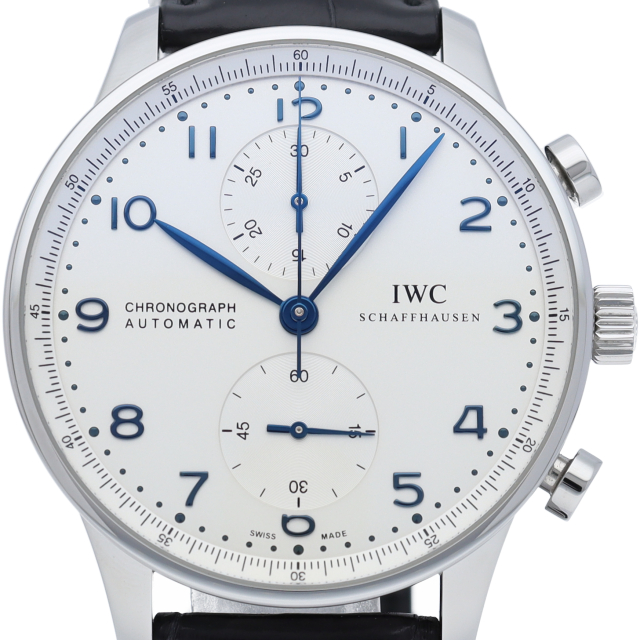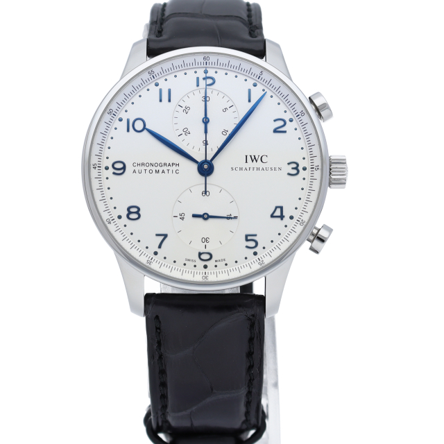 IWCの中でも特に人気の「ポルトギーゼ」。ホワイト文字盤にブルースティール針の相性が良く、縦の2つのクロノグラフが上品かつクラシカルな1本。
