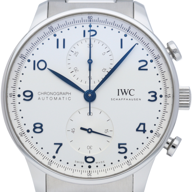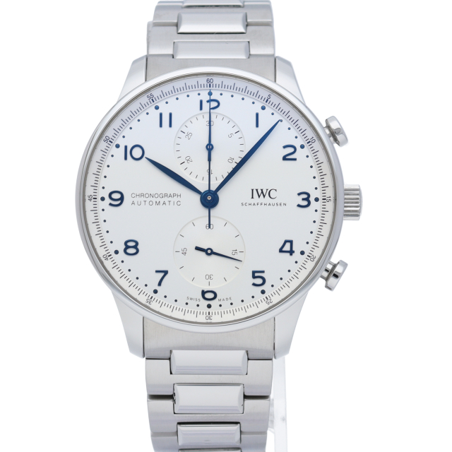 IWCの中でも特に人気の「ポルトギーゼ」。シルバー文字盤にブルースティール針の相性が良く、縦の2つのクロノグラフが上品かつクラシカルな1本。