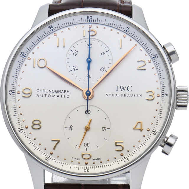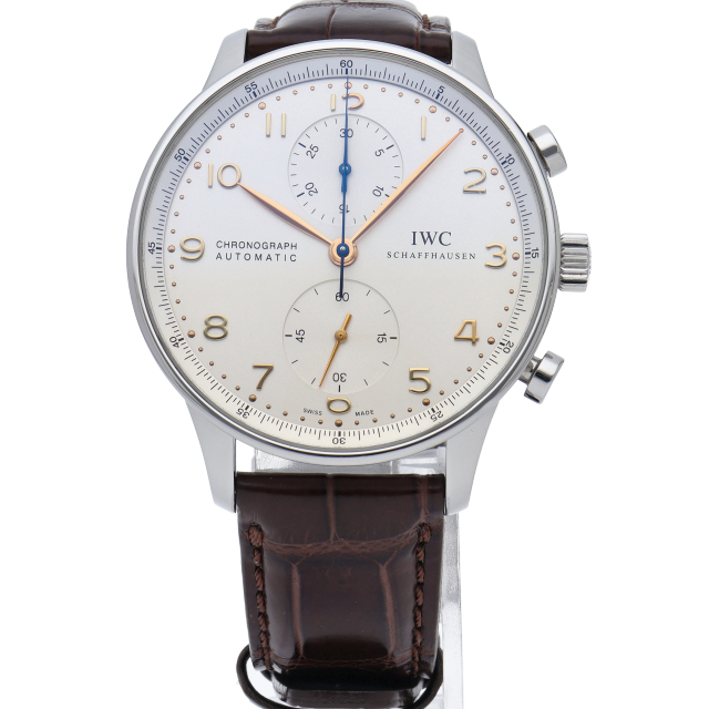 IWCの中でも特に人気の「ポルトギーゼ」。ホワイト文字盤にローズゴールド針の相性が良く、縦の2つのクロノグラフが上品かつクラシカルな1本。