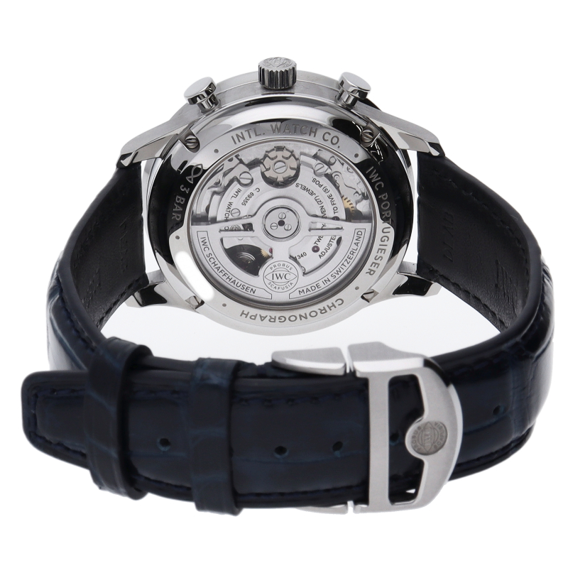 ポルトギーゼ クロノグラフは、クラシックな装いではあるものの、トレンドもおさえており使い回しが利く便利な一本です。こちらは、2022年に発表された裏蓋がサファイアクリスタルガラスのシースこちらは、2022年に発表された裏蓋がサファイアクリスタルガラスのシースルーバックモデル。自社製コラムホイール式クロノグラフムーブメントのCal.69355は、ペラトン式巻上げ機構に似た双方向巻上げ式の爪巻上げ機構を搭載します。