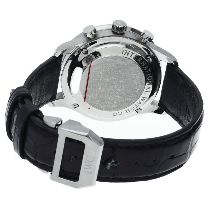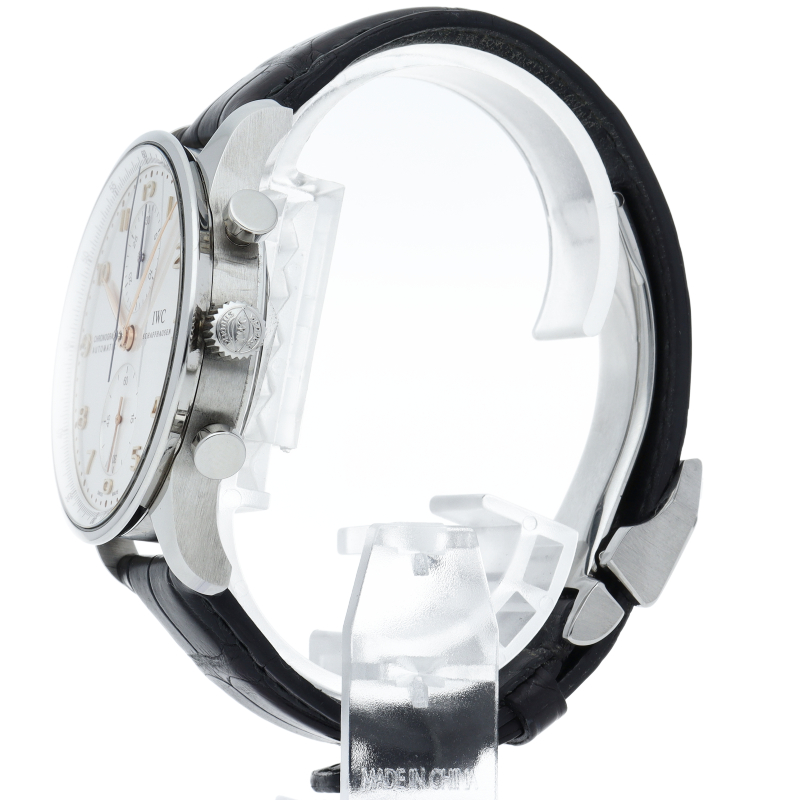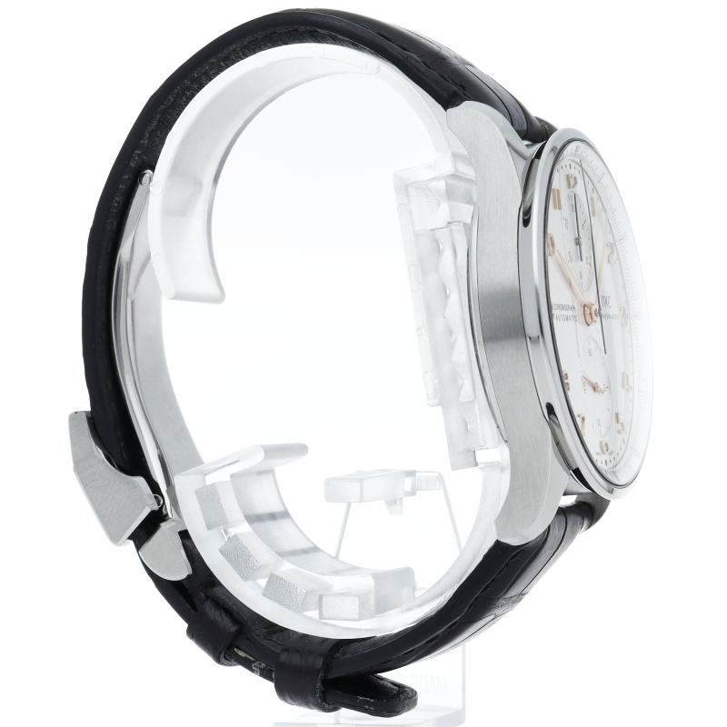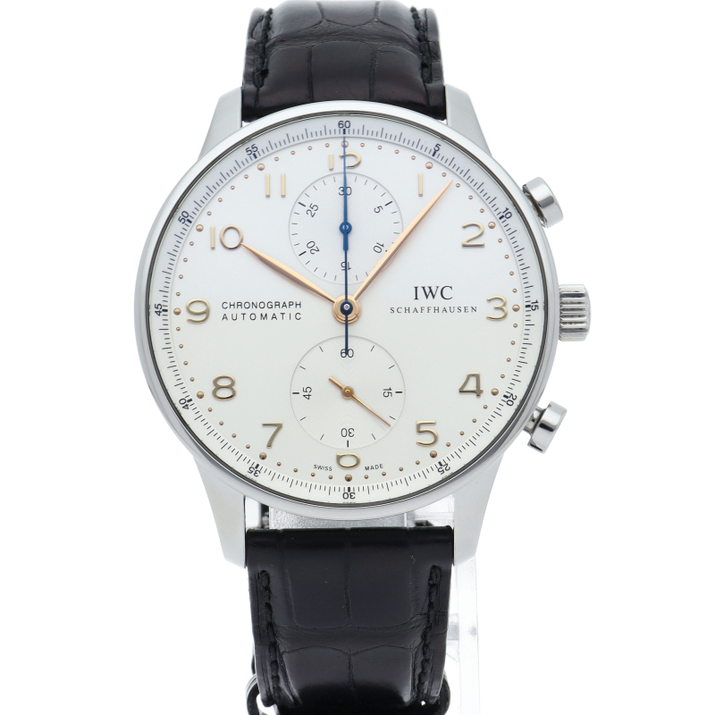 IWCの中でも特に人気の「ポルトギーゼ」。ホワイト文字盤にローズゴールド針の相性が良く、縦の2つのクロノグラフが上品かつクラシカルな1本。