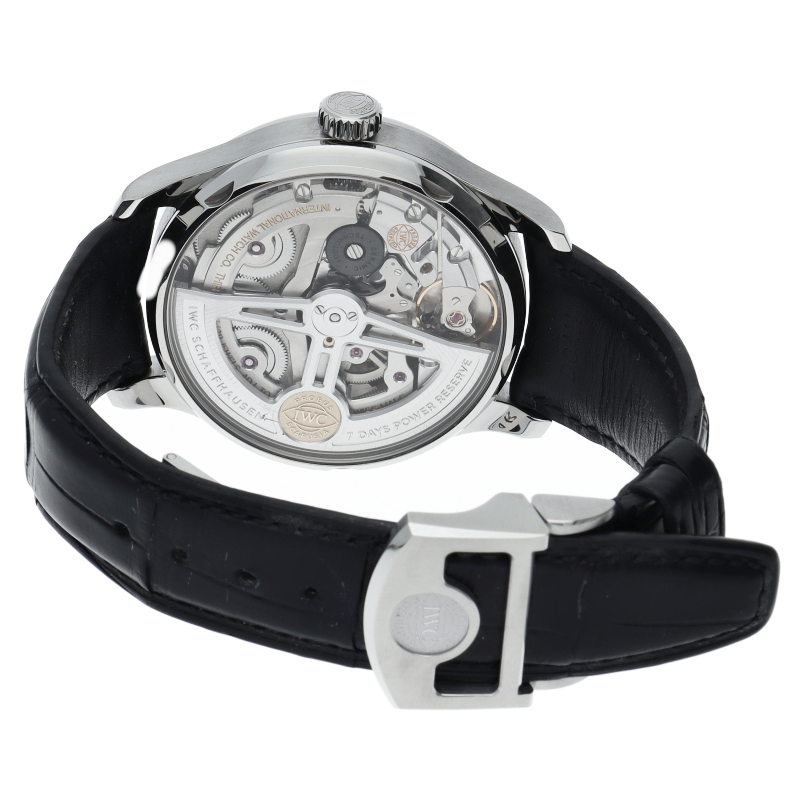 懐中時計をルーツとした大型ムーブメント搭載のコレクションがポルトギーゼです。クラシックな雰囲気を演出した、文字盤外周のレールウェイ、リーフ針、アップライトのインデックスは1930年代に製作されたポルトギーゼをモチーフとしています。ムーブメントはセラミック素材を多用したペラトン自動巻き機構のムーブメント・キャリバー52010を搭載。