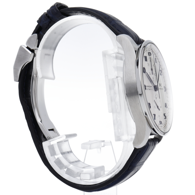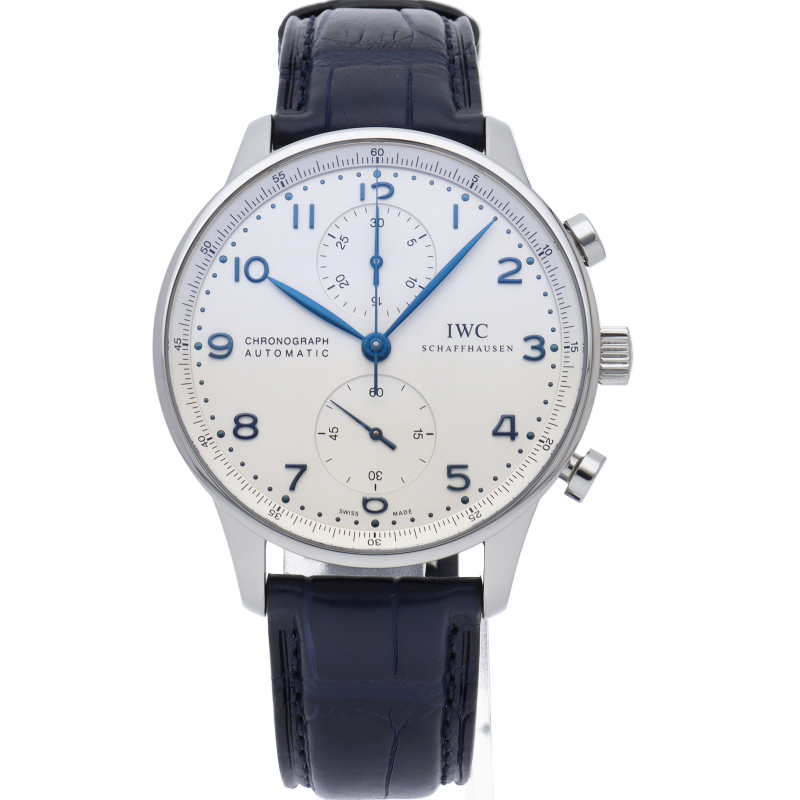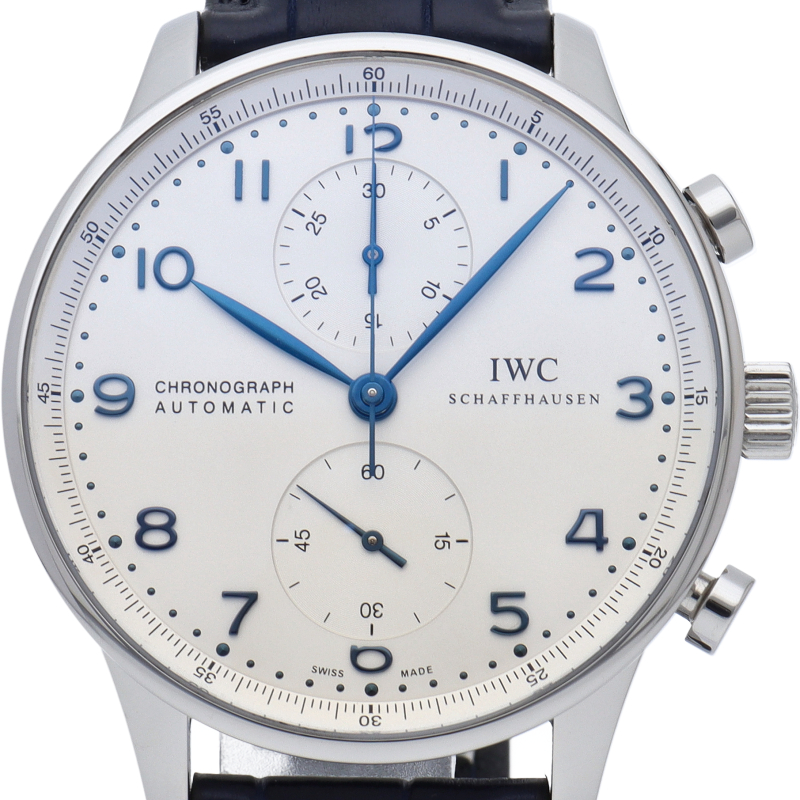 IWCの中でも特に人気の「ポルトギーゼ」。ホワイト文字盤にブルースティール針の相性が良く、縦の2つのクロノグラフが上品かつクラシカルな1本。