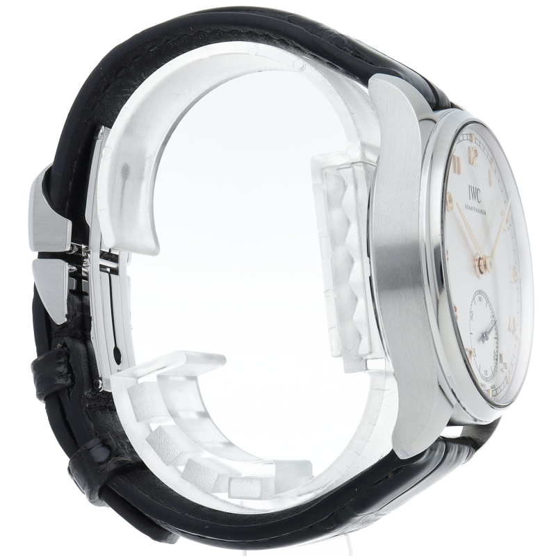 「ポルトギーゼ・オートマティック 40」は、「ポルトギーゼ」の特徴的なデザインを40mmというコンパクトなサイズで実現したモデルです。搭載された堅牢で高品質な自動巻きムーブメント、IWC自社製キャリバー82200は、耐摩耗性に優れたセラミック製のパーツをペラトン自動巻き機構に使用し、60時間のパワーリザーブを蓄えます。