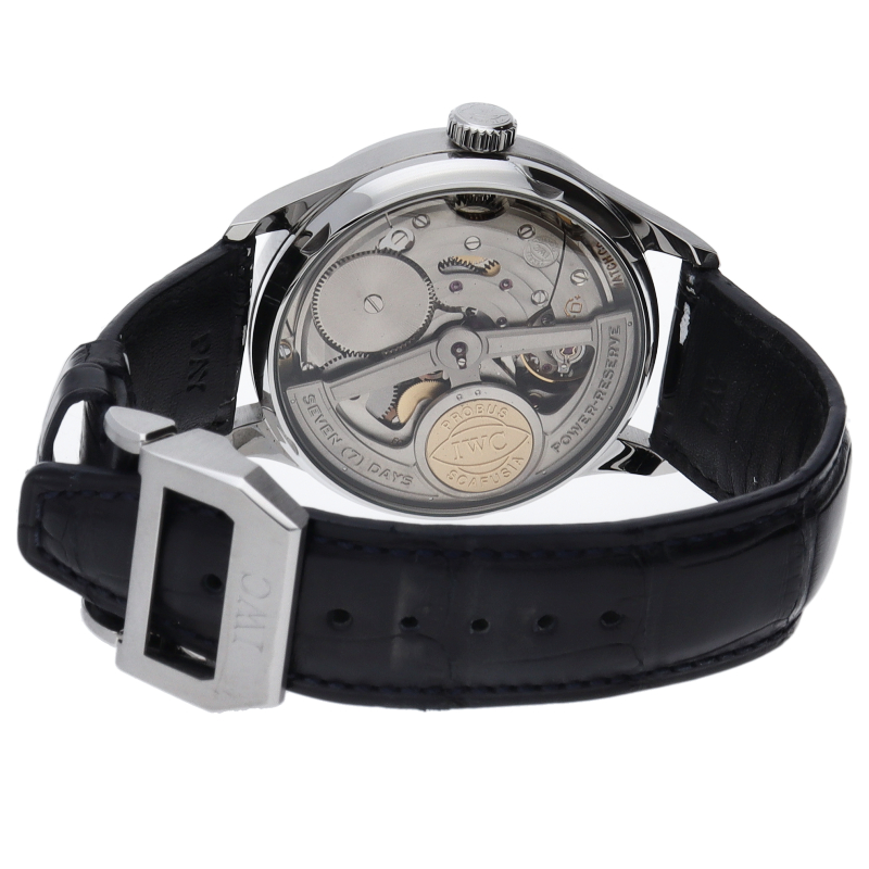 1930年代にポルトガル商人がオーダーメイドした時計を原形として製造が開始された“ポルトギーゼ”。こちらは、自社製ペラトン式ムーブメントCal.51011を搭載したモデルです。ゼンマイは全長900mmあり、7日間ものパワーリザーブを誇ります。シースルーバックから精巧な動きをご覧頂けますので、機械式時計が好きな方にお勧めしたいモデルです。