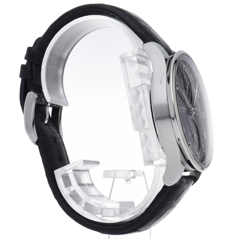 フラットな風防にブラック文字盤が浮かび、ブラッククロコレザーが誠実に魅せるウォッチです。フェイスにはすらっと伸びたシルバー指針やインデックスがスマートに、インダイヤルの配置がボディをスリムに魅せます。