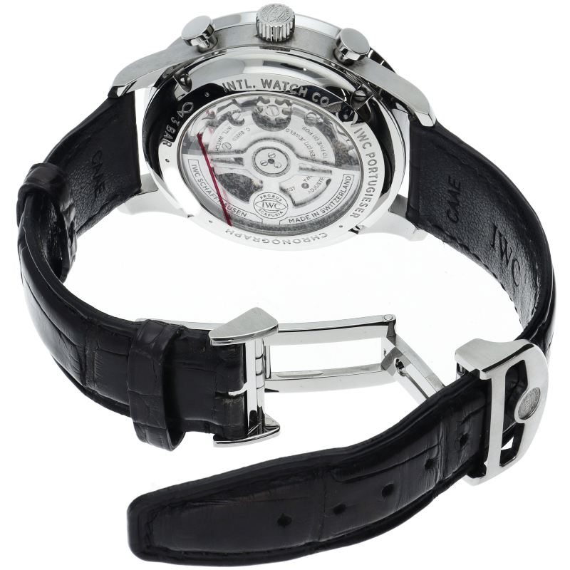 IWCの中でも特に人気の「ポルトギーゼ」。ケースいっぱいまで広げられたダイヤルにより、41mmのケース径よりも大き目に見えるデザインが特徴です。