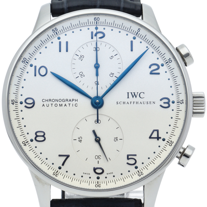 IWCの中でも特に人気の「ポルトギーゼ」。シルバー文字盤にブルースティール針の相性が良く、縦の2つのクロノグラフが上品かつクラシカルな1本。