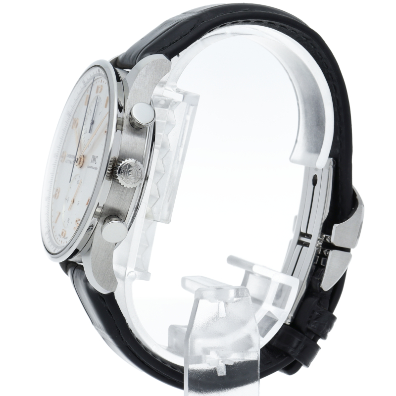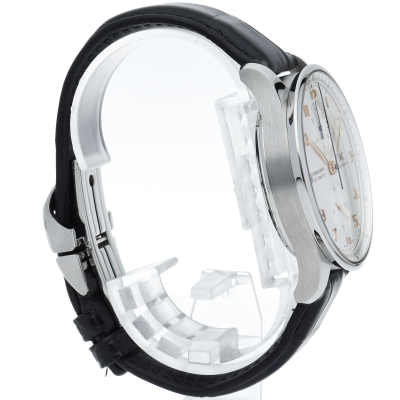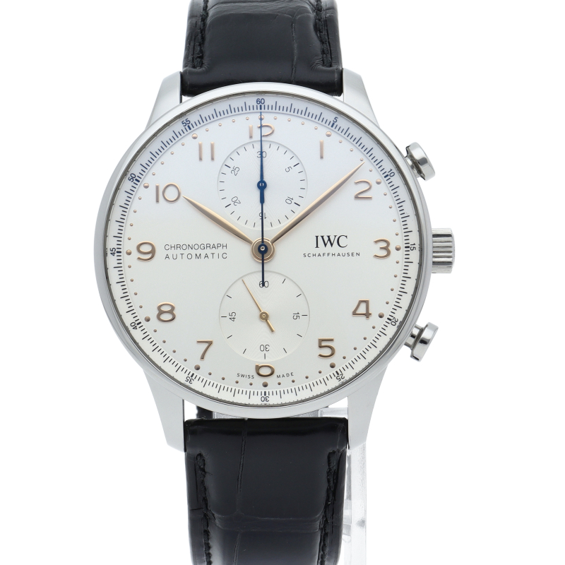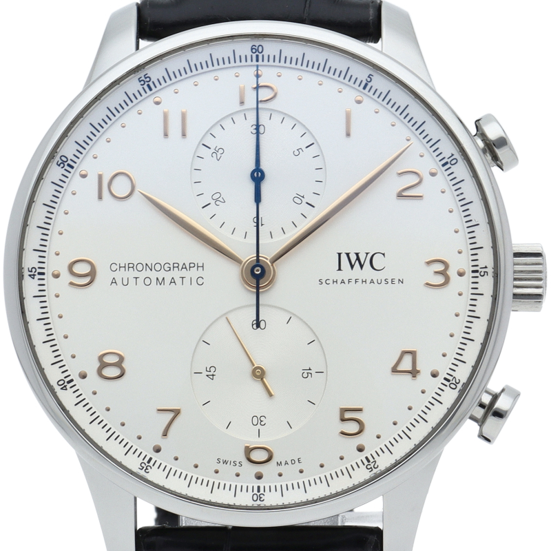 「ポルトギーゼ」はその洗練されたデザインでIWCの中でも人気の高いモデルの一つとなっています。センターにクロノグラフ用の秒針、12時側のインダイアルには30分積算計を備えたシンプルなクロノグラフです。