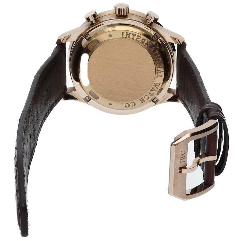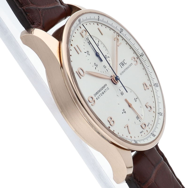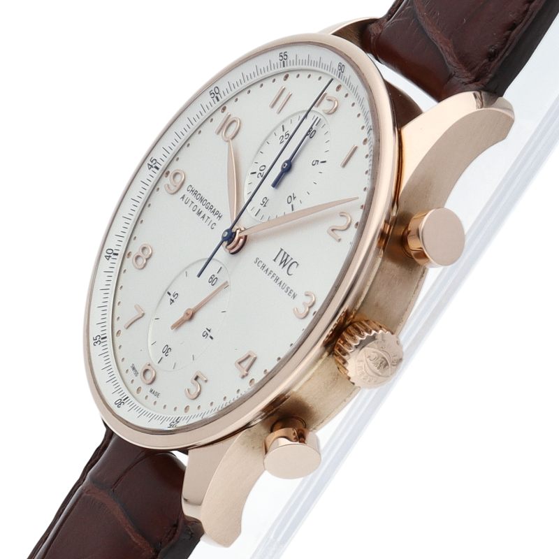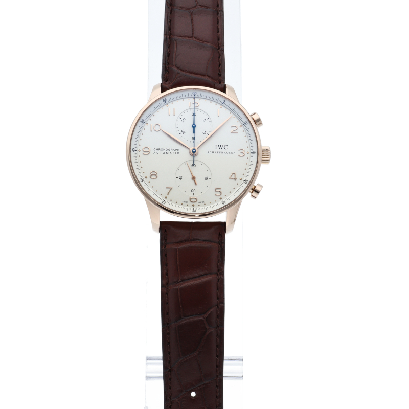 「ポルトギーゼ」はその洗練されたデザインでIWCの中でも人気の高いモデルの一つとなっています。センターにクロノグラフ用の秒針、12時側のインダイアルには30分積算計を備えたシンプルなクロノグラフです。