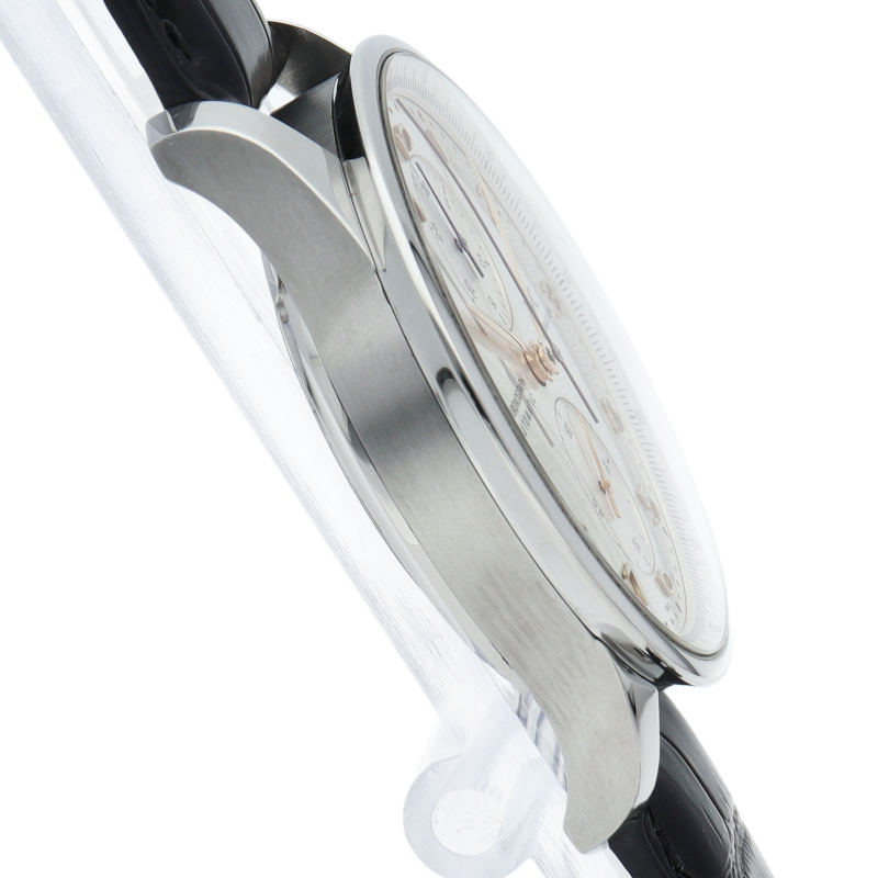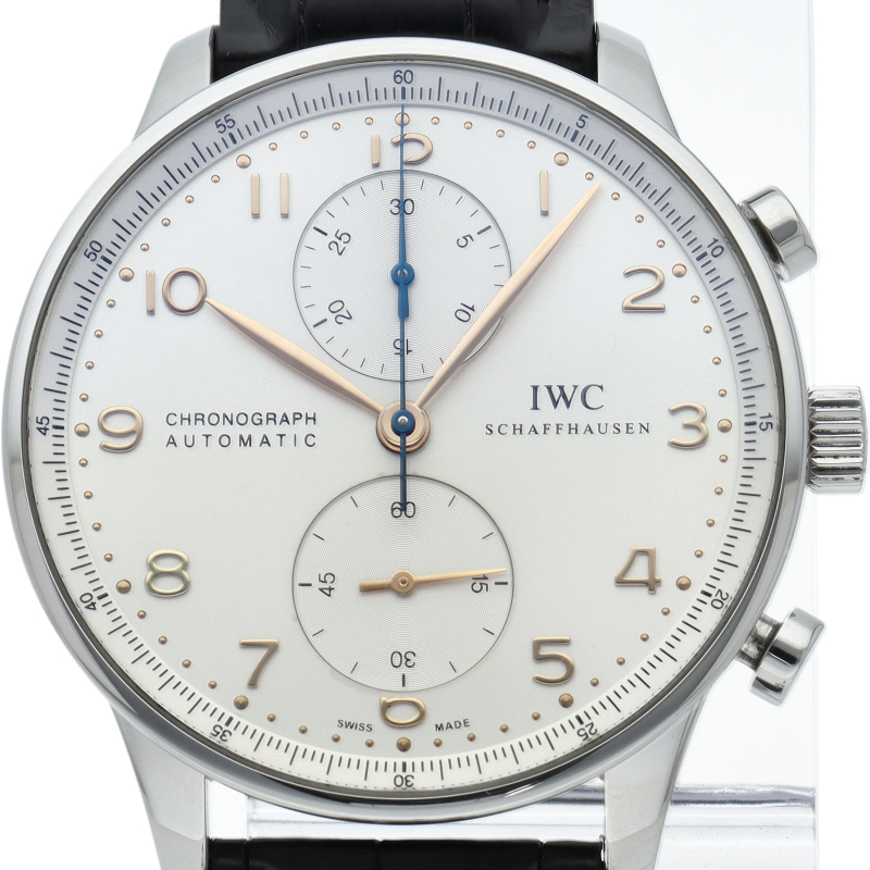 IWCの中でも特に人気の「ポルトギーゼ」。ホワイト文字盤にローズゴールド針の相性が良く、縦の2つのクロノグラフが上品かつクラシカルな1本。