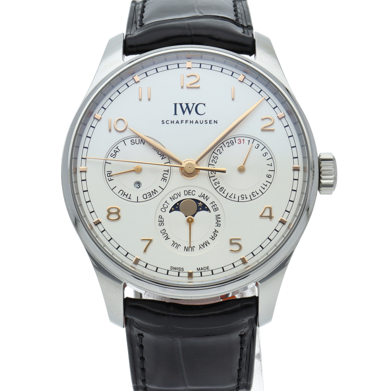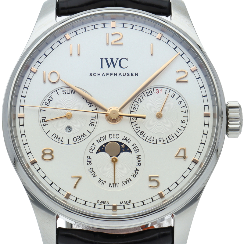 IWCの中でも特に人気の「ポルトギーゼ」。ムーブメントにはCal.82650を搭載、永久カレンダー、ムーンフェイズ機能が搭載されたコンプリケーションモデルです。
