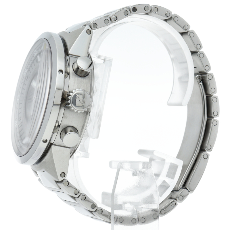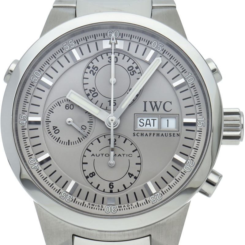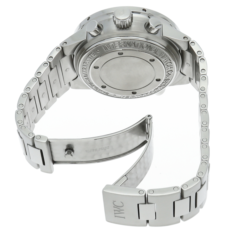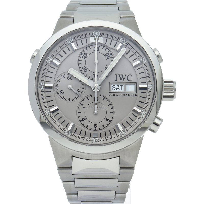永くIWCのスポーツラインを引っ張ってきた GSTシリーズ。現在のスポーツラインの看板であるアクアタイマーの原型ともいえるモデルです。こちらはスプリットセコンドクロノグラフを搭載したハイスペックモデル。クロノグラフの秒針が2本あるのでラップタイムの計測が可能です。