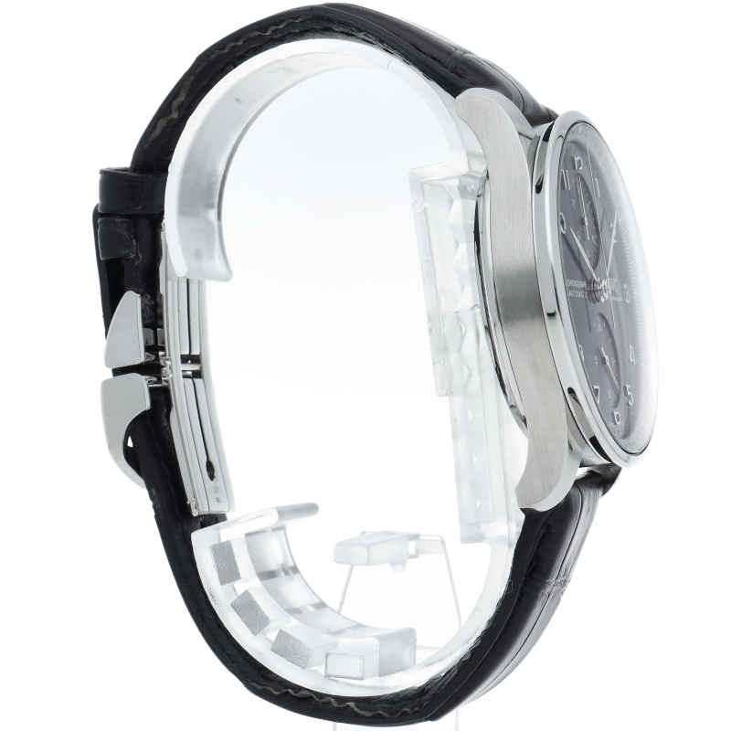 IWCの中でも特に人気の「ポルトギーゼ」。落ち着きのあるブラック文字盤に、シルバーの針とアラビアインデックスがキレイなモデルです。ムーブメントには同社の高い技術力が生み出した毎時28,800振動のCal.69355を搭載しています。