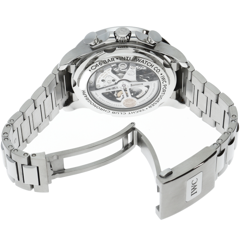 ポルトギーゼシリーズにおけるスポーツモデルの「ポルトギーゼ・ヨットクラブ・クロノグラフ」。シースルーバック仕様の44.6mmケースには、フライバック機能付き、68時間パワーリザーブの自社製クロノグラフムーブメントのキャリバー89361を搭載しています。
