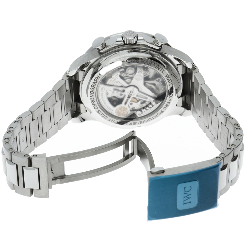 ポルトギーゼシリーズにおけるスポーツモデルの「ポルトギーゼ・ヨットクラブ・クロノグラフ」。シースルーバック仕様の44.6mmケースには、フライバック機能付き、68時間パワーリザーブの自社製クロノグラフムーブメントのキャリバー89361を搭載しています。