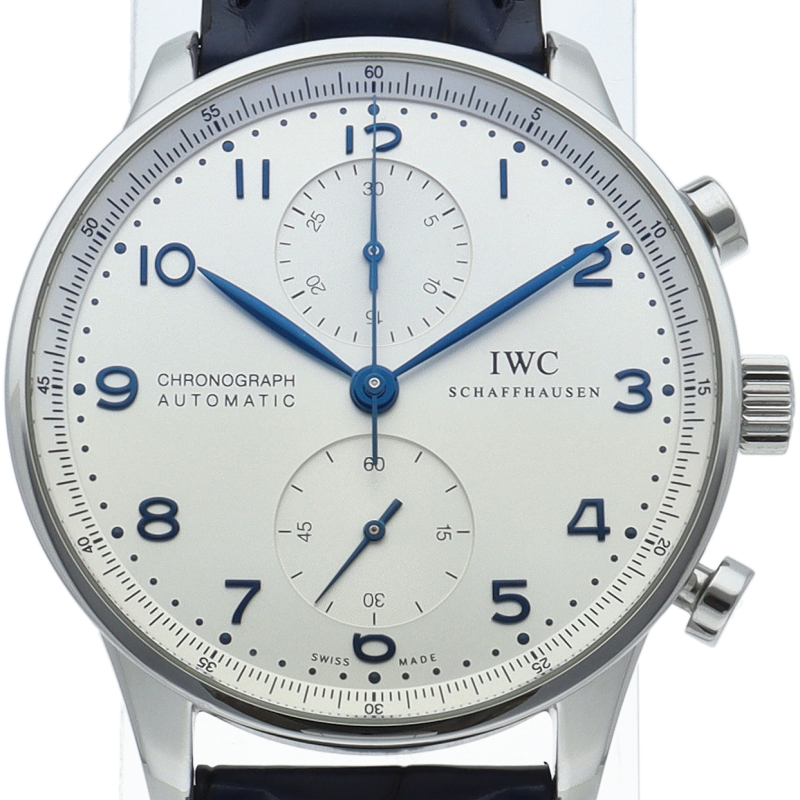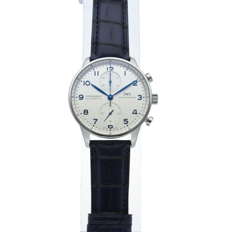 IWCの中でも特に人気の「ポルトギーゼ」。ホワイト文字盤にブルースティール針の相性が良く、縦の2つのクロノグラフが上品かつクラシカルな1本。
