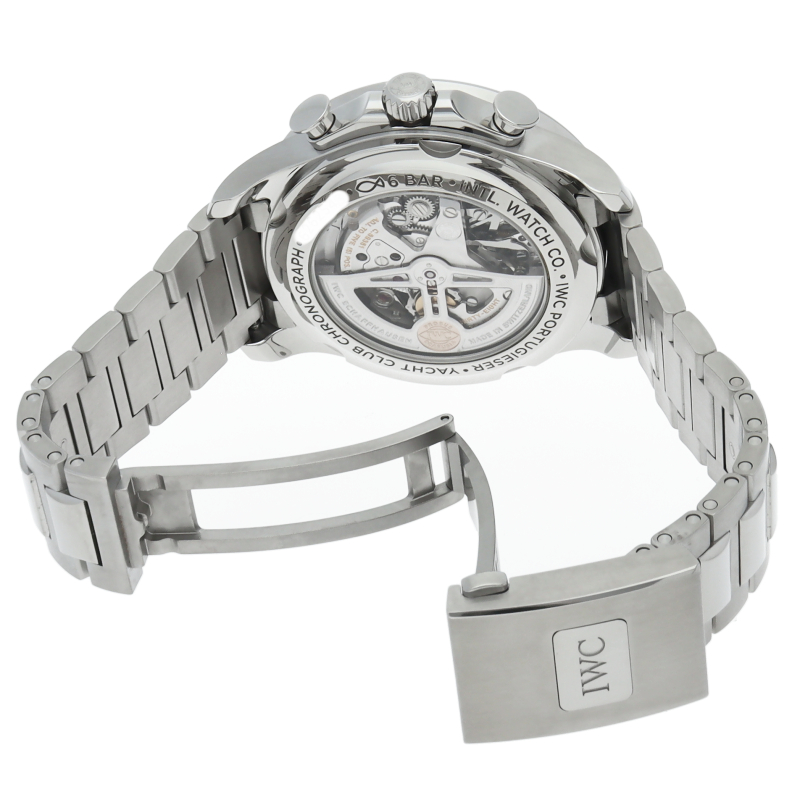 ポルトギーゼシリーズにおけるスポーツモデルの「ポルトギーゼ・ヨットクラブ・クロノグラフ」。シースルーバック仕様の44.6mmケースには、フライバック機能付き、68時間パワーリザーブの自社製クロノグラフムーブメントのキャリバー89361を搭載しています。