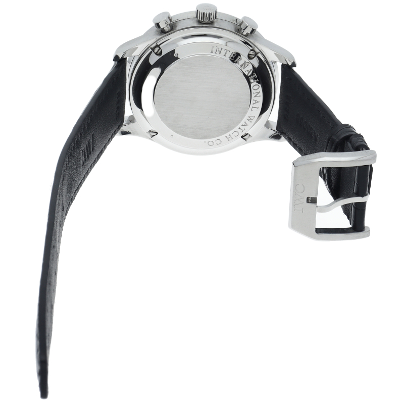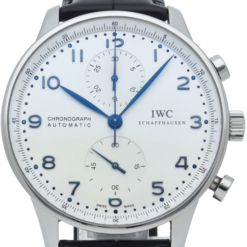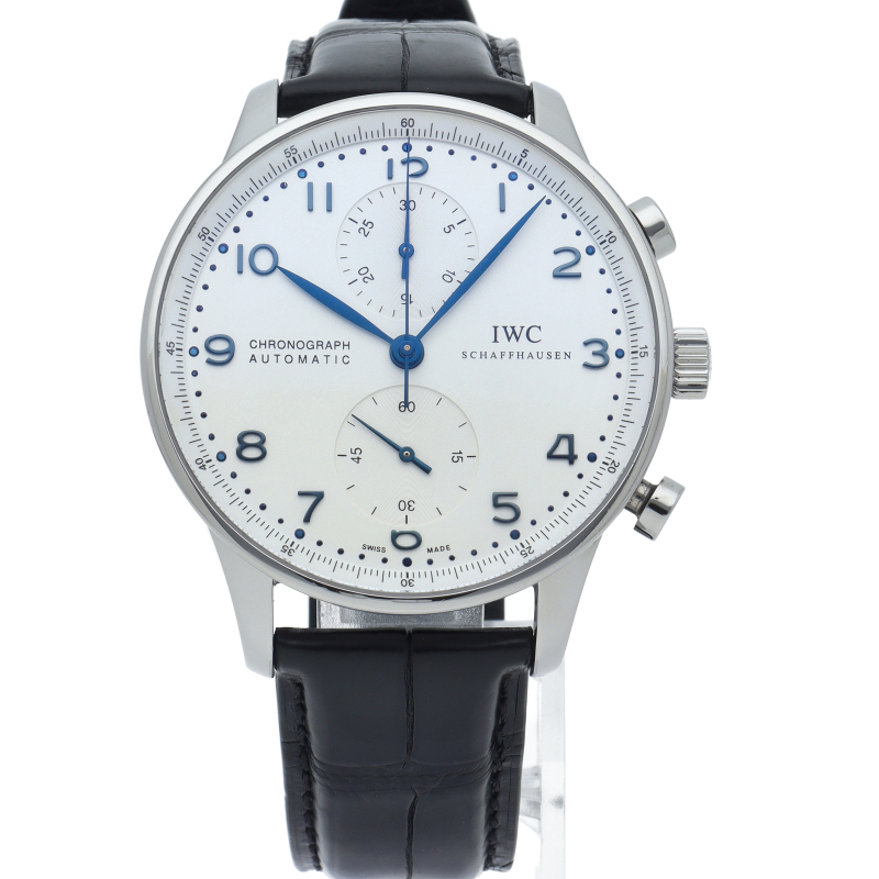 IWCの中でも特に人気の「ポルトギーゼ」。ホワイト文字盤にブルースティール針の相性が良く、縦の2つのクロノグラフが上品かつクラシカルな1本。