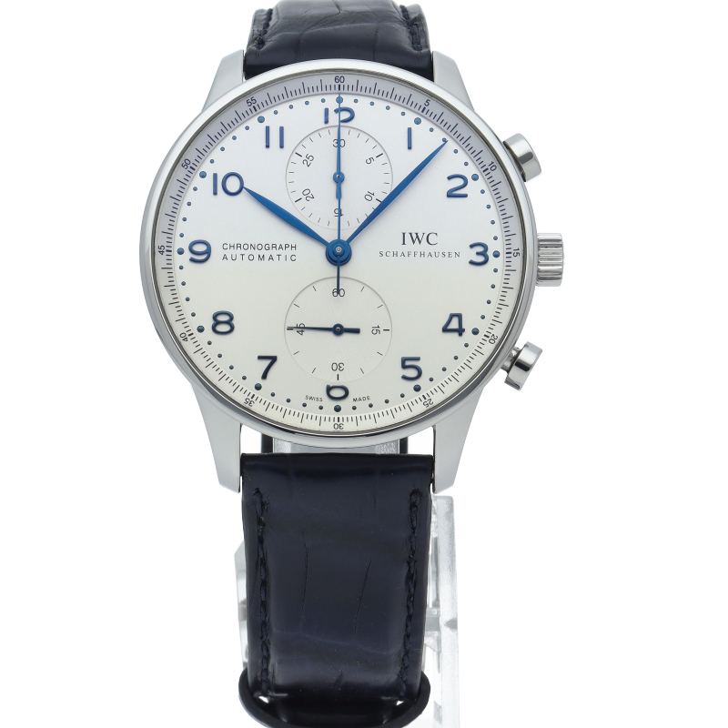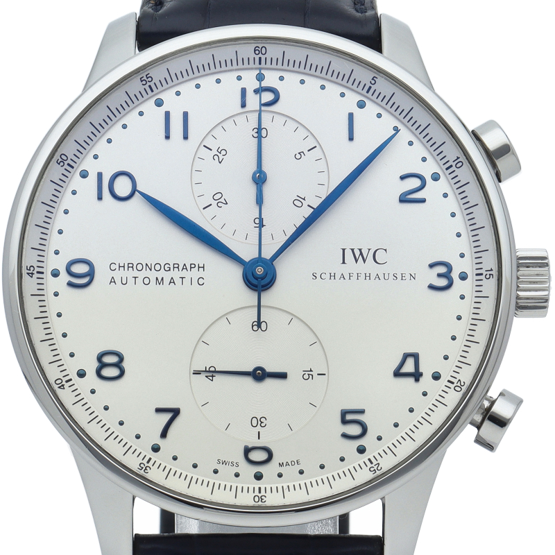 IWCの中でも特に人気の「ポルトギーゼ」。ホワイト文字盤にブルースティール針の相性が良く、縦の2つのクロノグラフが上品かつクラシカルな1本。