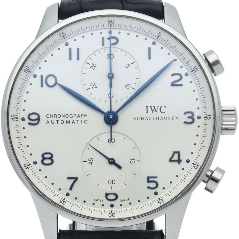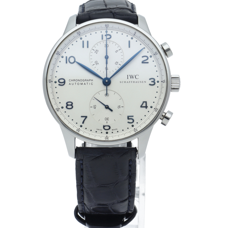 IWCの中でも特に人気の「ポルトギーゼ」。ホワイト文字盤にブルースティール針の相性が良く、縦の2つのクロノグラフが上品かつクラシカルな1本。