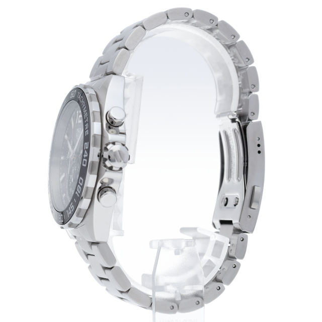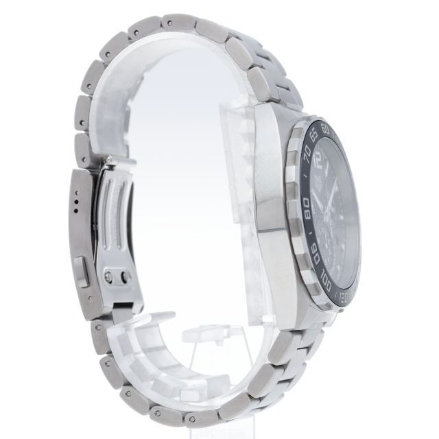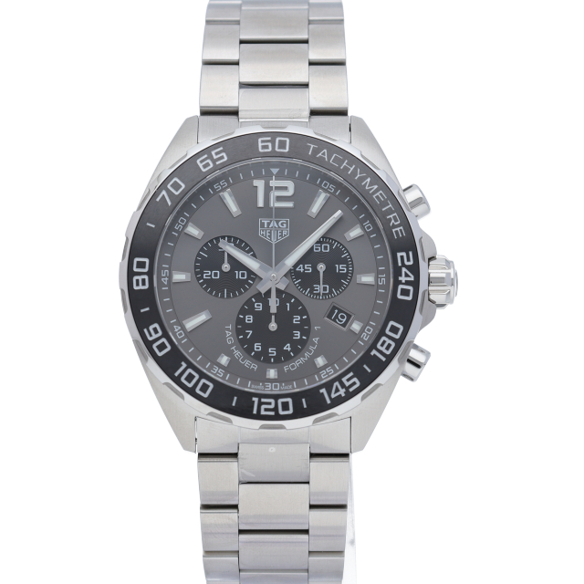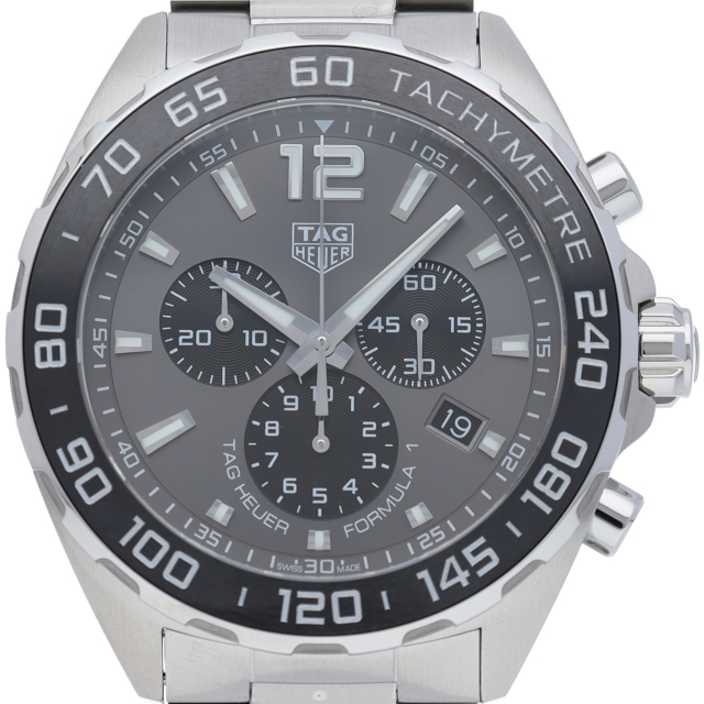 タグホイヤーの人気モデル「フォーミュラ1」。6時位置のインダイアルに1/10秒計を配し、クラシックな3つのカウンターを備えたメンズクロノグラフのデザインにアントラサイトグレーの文字盤を採用。