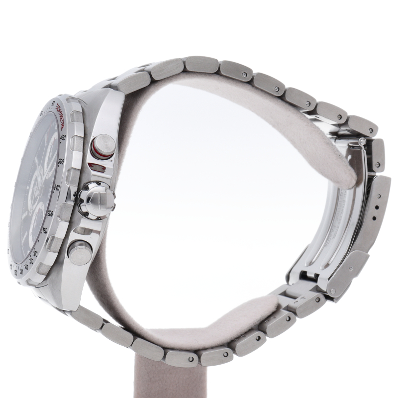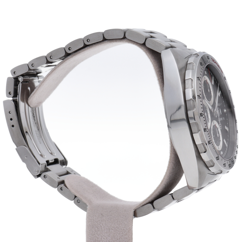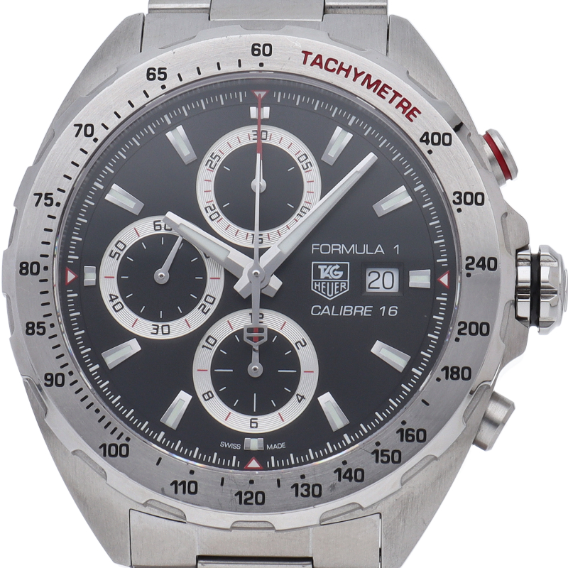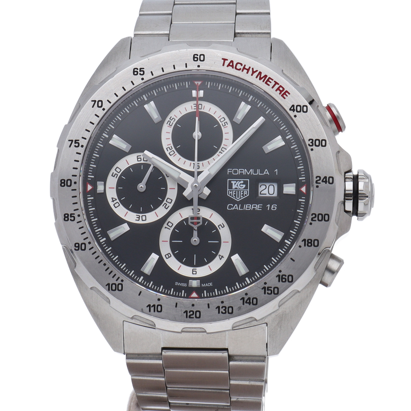 タグホイヤーの人気モデル「フォーミュラ1」。ブラックの文字盤、3つのサブダイヤル、距離を速度に変換するタキメータースケール付きスティール製逆回転防止ベゼルが付属した44㎜のプロフェッショナル スポーツクロノグラフ。 レーシングにインスピレーションを得たベゼルのノッチは、このベストセラー コレクションを象徴する特徴です。