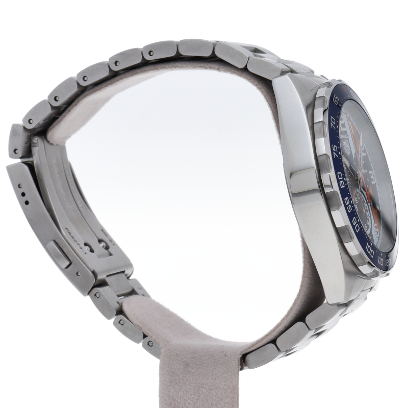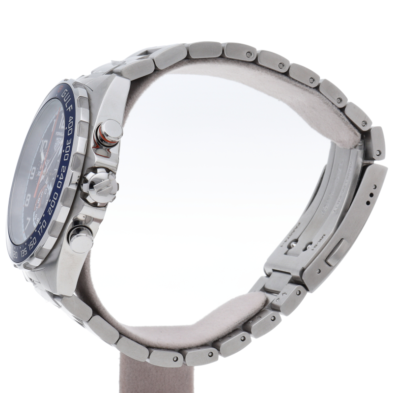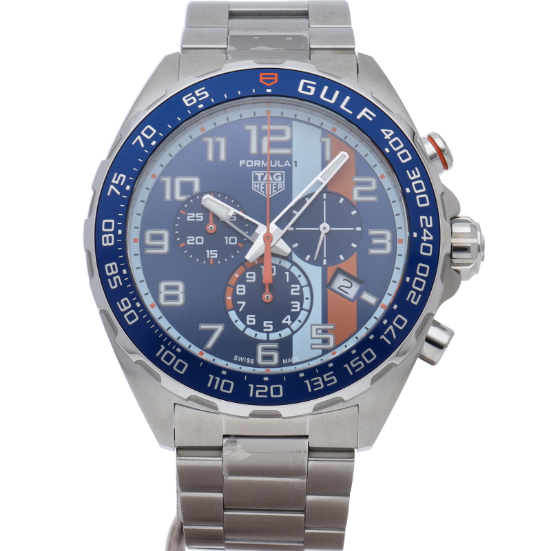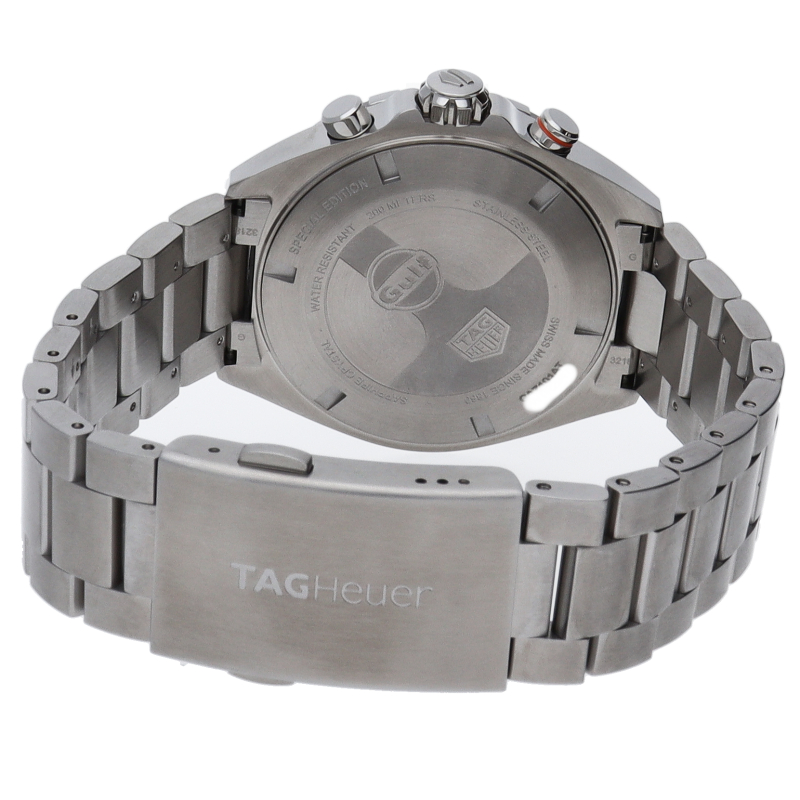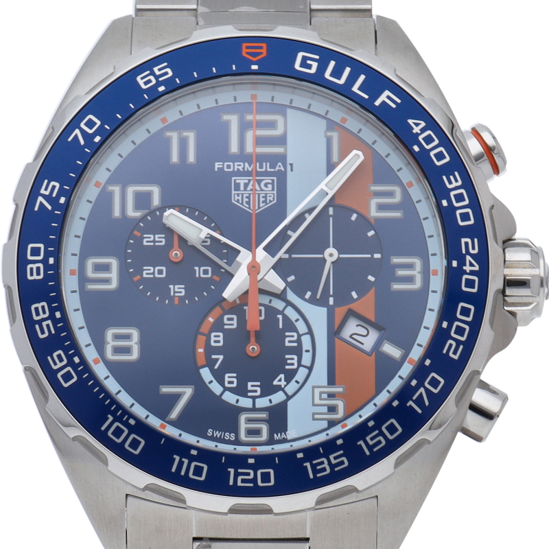 ブルーのサンレイ加工サテン仕上げダイヤルとサブダイヤルを、一目でそれとわかるガルフのアイコニックなブルー&オレンジのストライプが誇り高く飾るデザイン。勝利を象徴するカラーです。