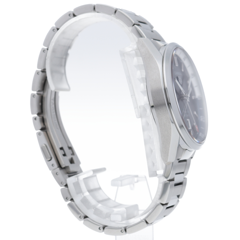 キャリバー7ツインタイムを搭載したこのモデルは、ダイヤル外縁の24時間計と先端の赤いGMT針でセカンドタイムゾーンを表示し、ケースバックからムーブメントの精緻な意匠が鑑賞できるのも魅力です。