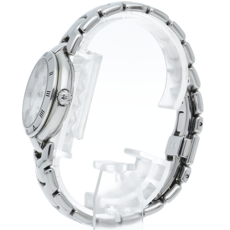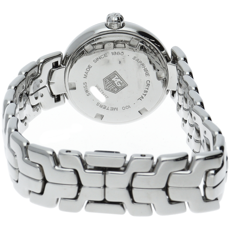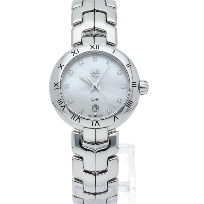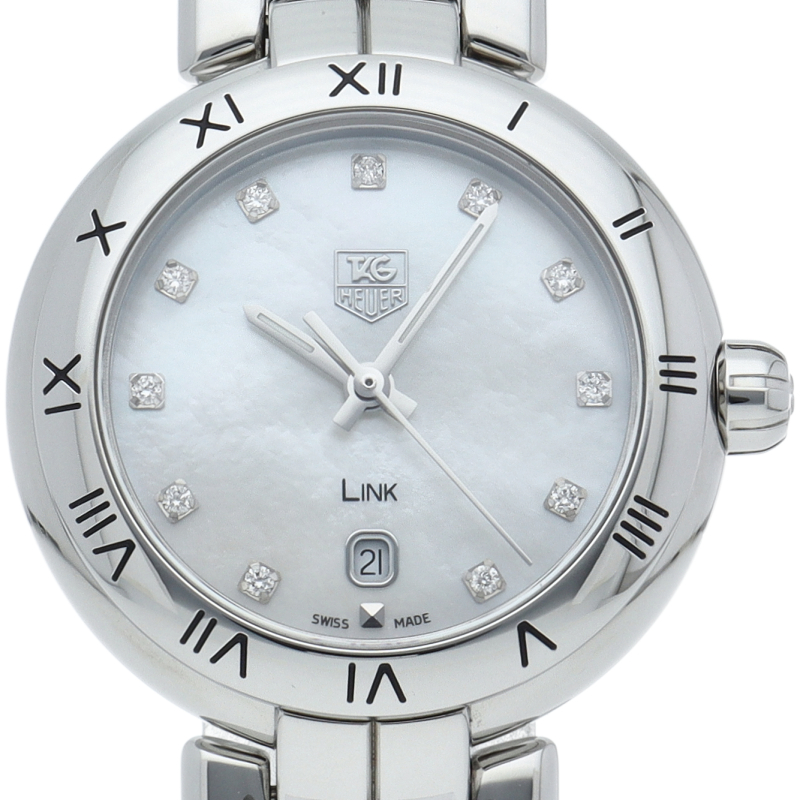 タグ・ホイヤーの「リンク」です。 ホワイトシェル文字盤の上で11Pのインデックスダイヤが美しく輝きます。 ベゼルにはローマ数字、6時位置にはデイト表示を備え、実用面での機能も申し分無い「才色兼備」なモデルです。