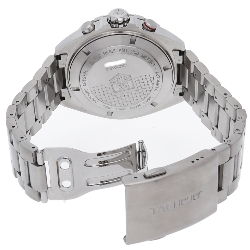 タグホイヤーの人気モデル「フォーミュラ1」。ブラックの文字盤、3つのサブダイヤル、距離を速度に変換するタキメータースケール付きスティール製逆回転防止ベゼルが付属した44mmのプロフェッショナル スポーツクロノグラフ。 レーシングにインスピレーションを得たベゼルのノッチは、このベストセラー コレクションを象徴する特徴です。