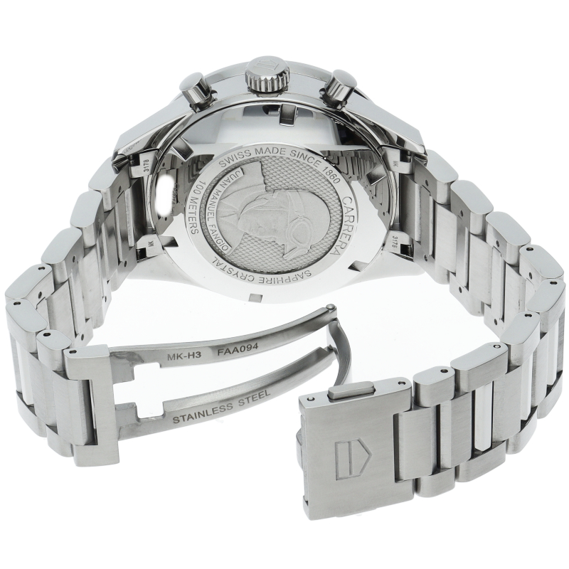 人気のカレラシリーズのニューモデル「カレラ キャリバー16 クロノグラフ」。ムーブメントにはヴァルジュー7750をベースとし、タグ・ホイヤーでチューンナップされた42時間パワーリザーブの「キャリバー16」を搭載します。裏蓋にはアルゼンチンの伝説的なF1ドライバーで、計5回ものワールドチャンピオンに輝いたファン・マヌエル・ファンジオのエングレービングが施されています。