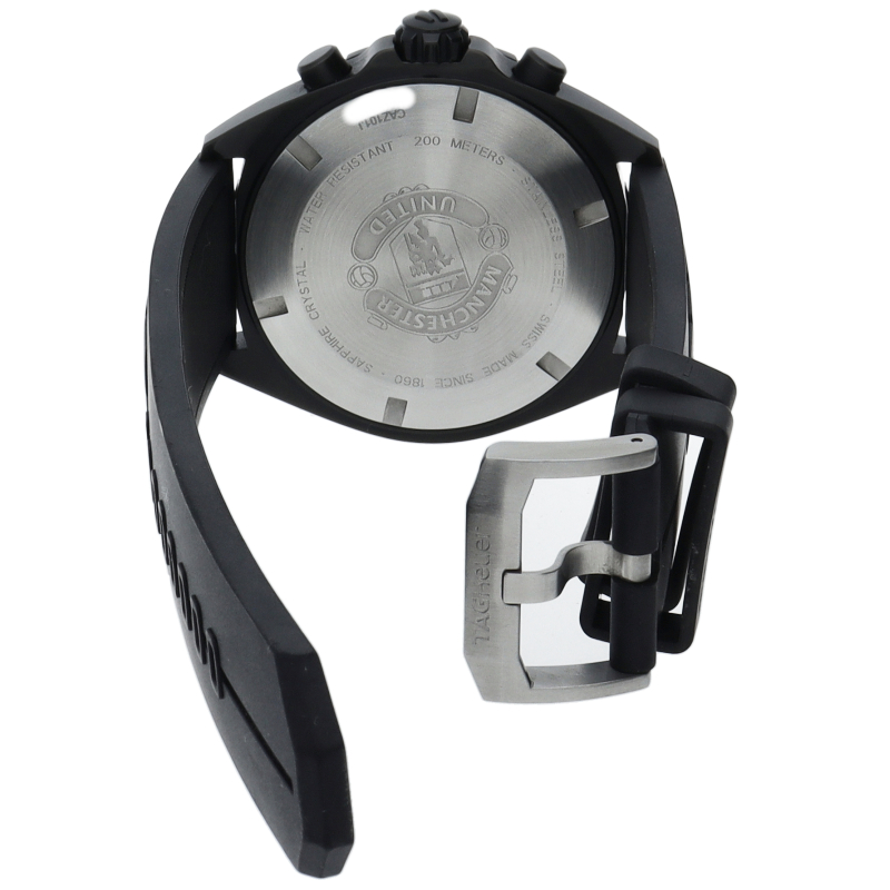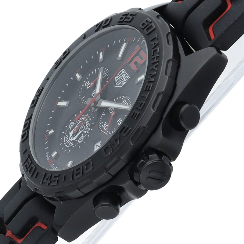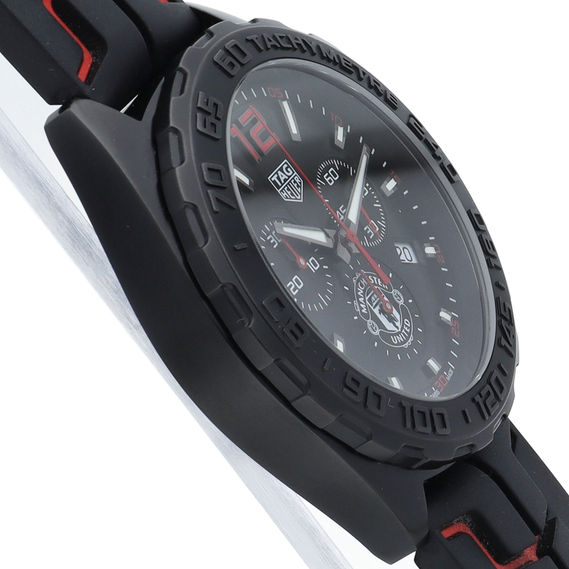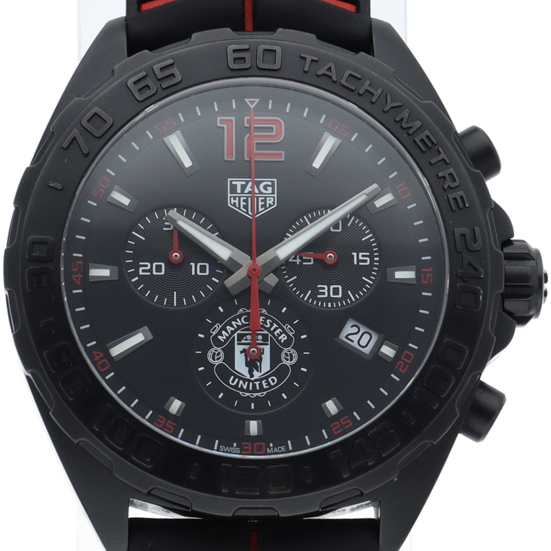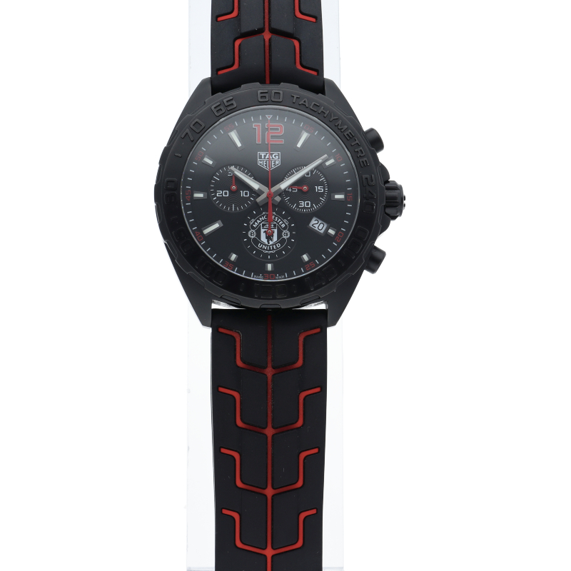 タグ・ホイヤーとマンチェスターユナイテッドとのパートナーシップを記念して製造された「フォーミュラ1 マンチェスターユナイテッド」。文字盤の6時位置にはマンチェスターユナイテッドのロゴをプリントして、ブレスレットの様にも見える立体的なラバーストラップにも効果的にイメージカラーの赤色を指し色で使用しています。ステンレスケースにブラックPVD加工を施すことでスポーティで力強い印象です。