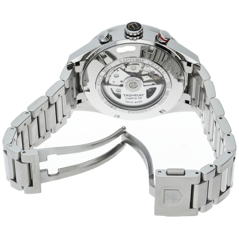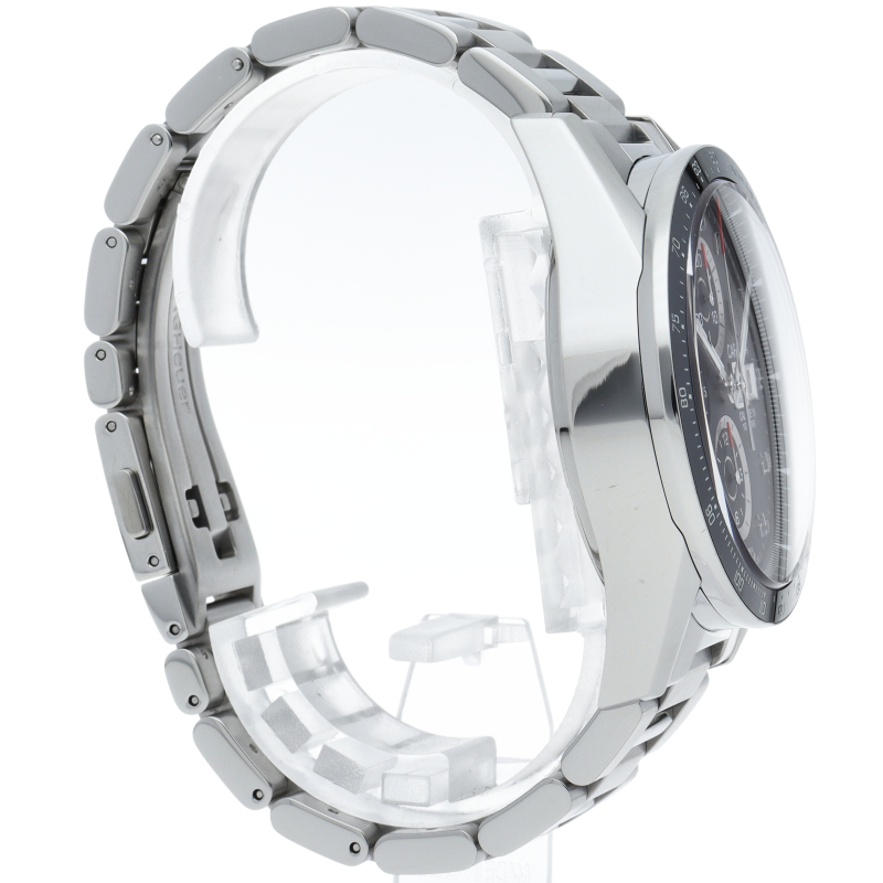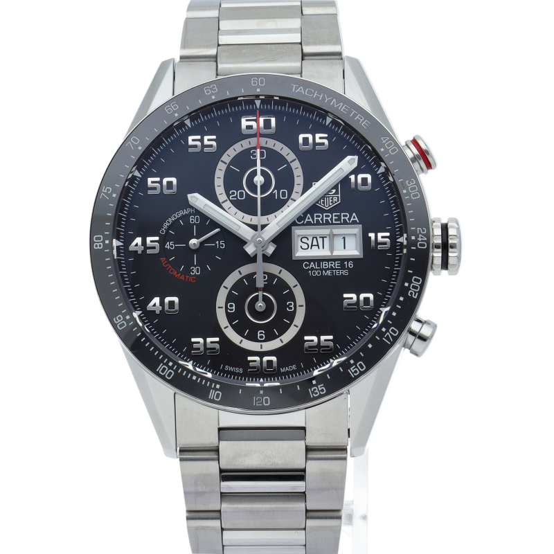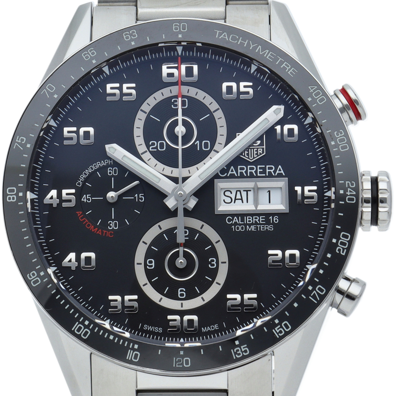 カレラクロノグラフタキメーターのケースと文字盤をベースに曜日表示を加え、カレラタキメーターの防水機能と重厚なブレスレットをもって新たに登場しました。クロノグラフ秒針とスタートボタンには、さり気なくレッドの差し色が施されています。また、サファイアクリスタルの風防には、両面反射防止コーティングが施され、更に文字盤の視認性が良くなっています。