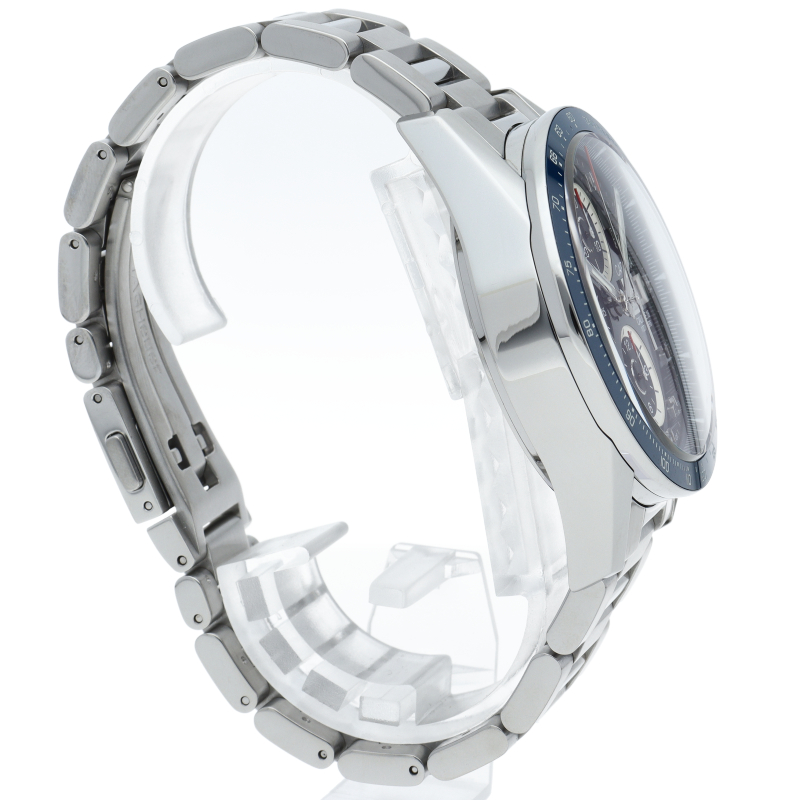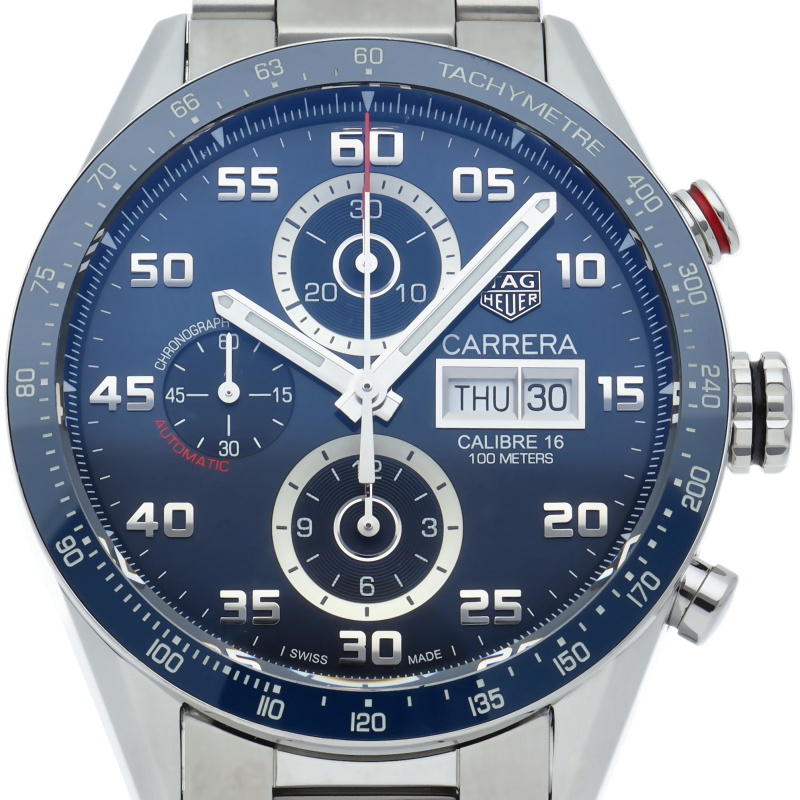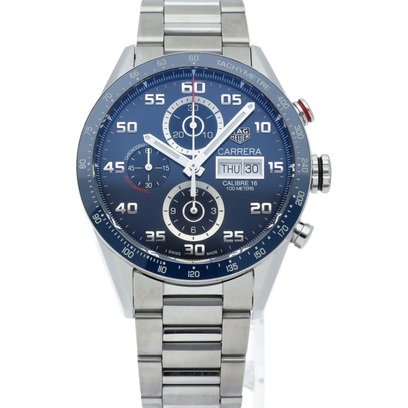 ブルーのレーシングクロノグラフには、堅牢で信頼性の高いキャリバー16自動巻ムーブメントが搭載されています。 スポーティなタグ・ホイヤー カレラは、スーパールミノバRが塗布されたアラビア数字、6時、9時、12時位置の3つのサブダイヤル、3時位置のデイデイト表示窓を備えています。