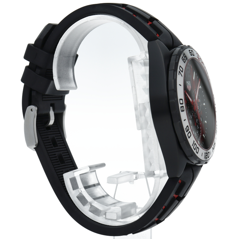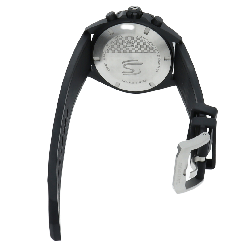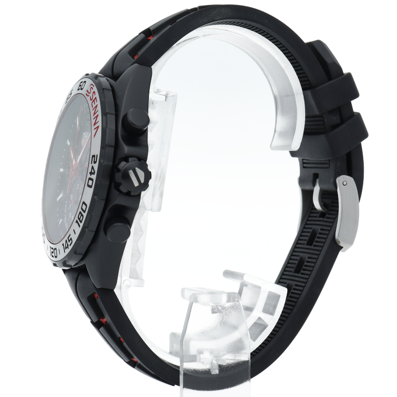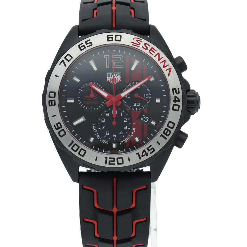 F1をイメージして作られたタグホイヤーの「フォーミュラ1」。カジュアルなスタイルとF1という極限下の環境でも活躍できる機能性を兼ね備えています。こちらは音速の貴公子と讃えられた伝説のF1ドライバーのアイルトンセナのトリビュートモデル。ミドルケースにはブラックPVD加工を施し力強い印象で、また防水性能も200m確保していますのでON/OFF問わず使い勝手の良いモデルです。