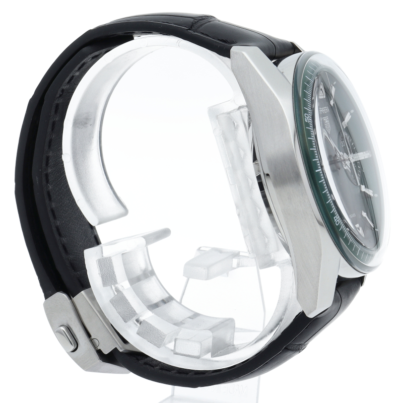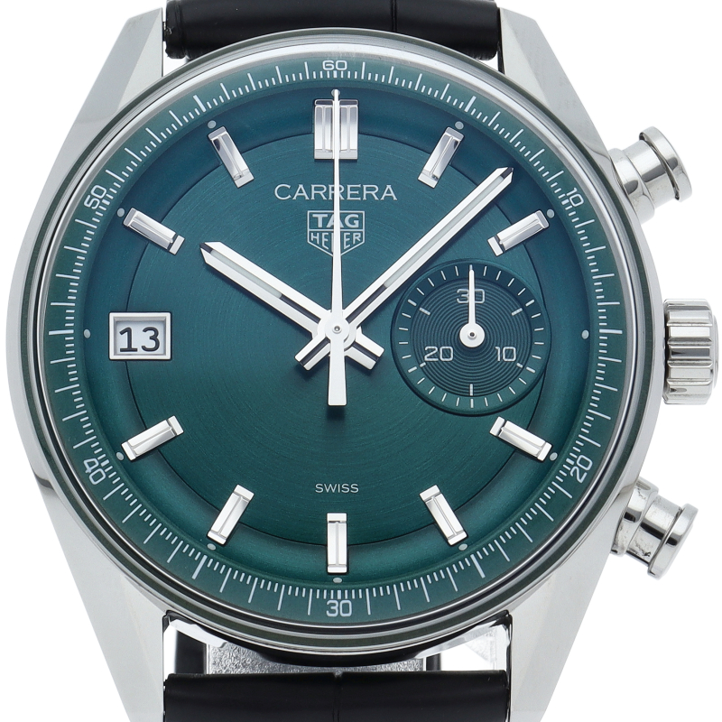 ヘリテージにコンテンポラリーなエッジを効かせた39mm径のタグ・ホイヤー カレラ クロノグラフ。カレラ60周年を迎えたコレクションの大胆なスピリットを閉じ込めたモデルです。9時位置にデイト表記、3時位置に30分積算計を配置し、美しいサーキュラーサテン仕上げのティールグリーンを採用した特徴的なダイヤル。グラスボックス風防を装着し、ヴィンテージテイストを感じさせます。