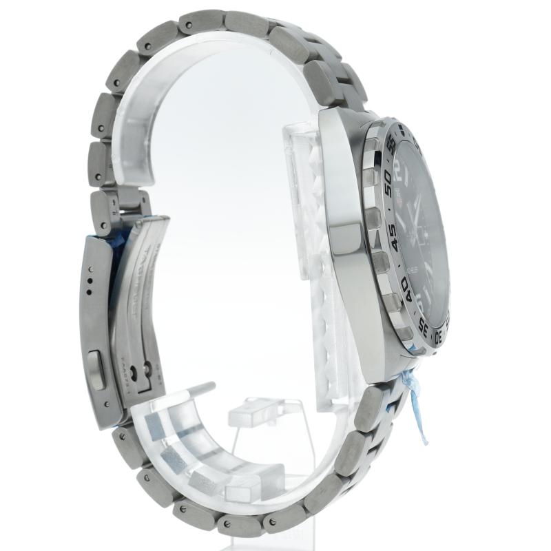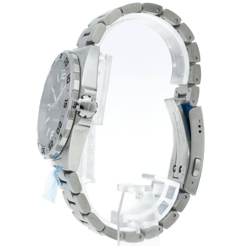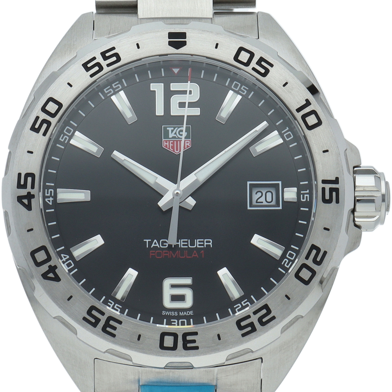 タグ・ホイヤーの人気シリーズ「フォーミュラ1」。レッドチップのアクセント付きスモールセコンド針に、タグ・ホイヤーを象徴するホワイト、レッド、グリーン配色のロゴが、文字盤を読みやすく、大胆なデザインに仕上げています。