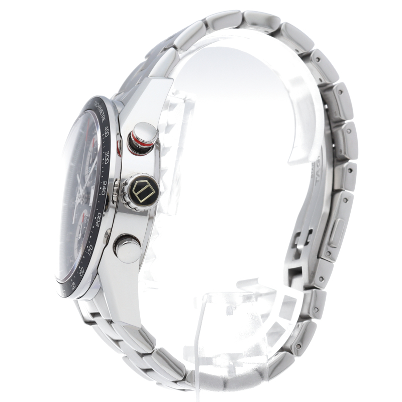 カレラクロノグラフタキメーターのケースと文字盤をベースに曜日表示を加え、重厚なブレスをもって新たに登場。また、風防には両面反射防止コーティングが施され、更に文字盤の視認性が良くなっています。