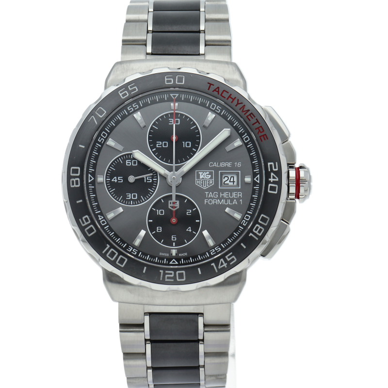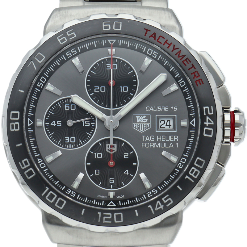 タグ・ホイヤーの人気シリーズ「フォーミュラ1」。スポーティーでスタイリッシュなデザインで深みのあるグレー文字盤に注目です。キャリバー16が搭載されたオートマッチ仕様です。