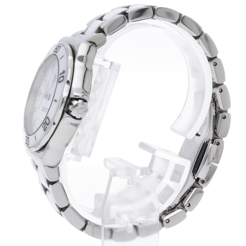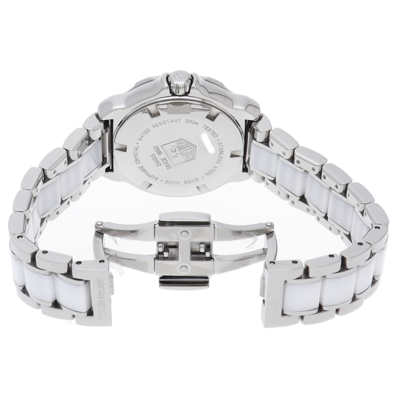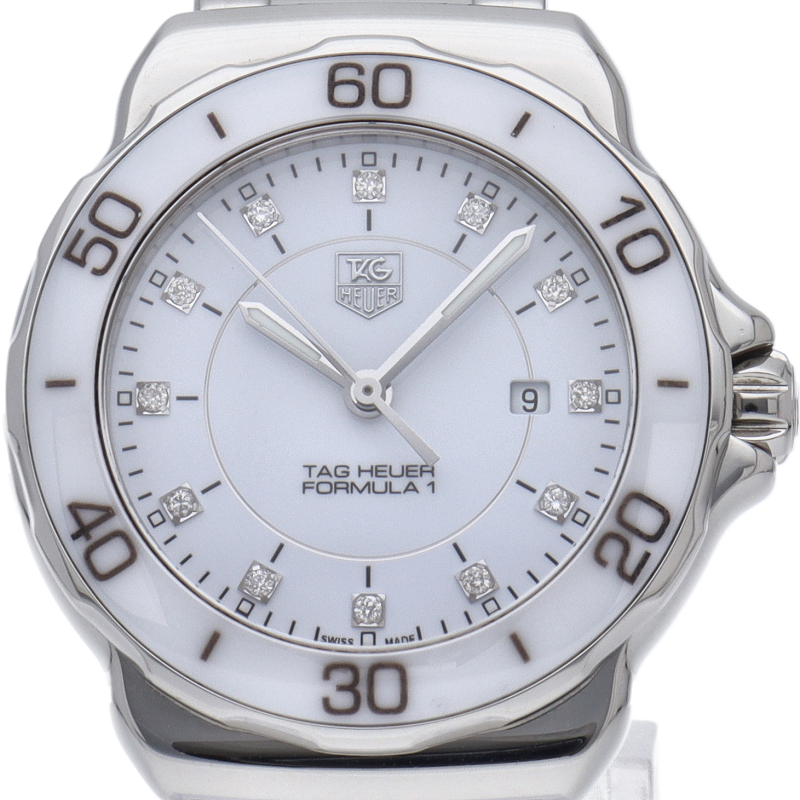 タグ・ホイヤーの人気シリーズ「フォーミュラー1」。セラミックとステンレスを組み合わせたブレスレットは、しなやかにフィットします。爽やかなホワイトが細かく使われたダイヤモンドが女性らしいエレガントな印象です。