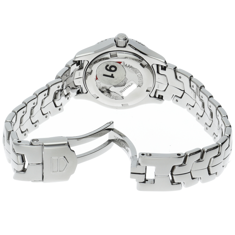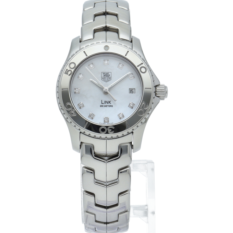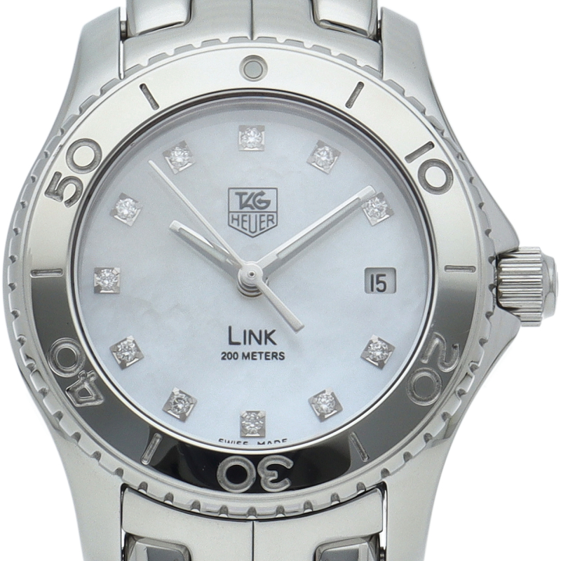 タグ・ホイヤーの「リンク」です。 ホワイトシェル文字盤の上で11Pのインデックスダイヤが美しく輝きます。 3時位置にはデイト表示を備え、実用面での機能も申し分無い「才色兼備」なモデルです。