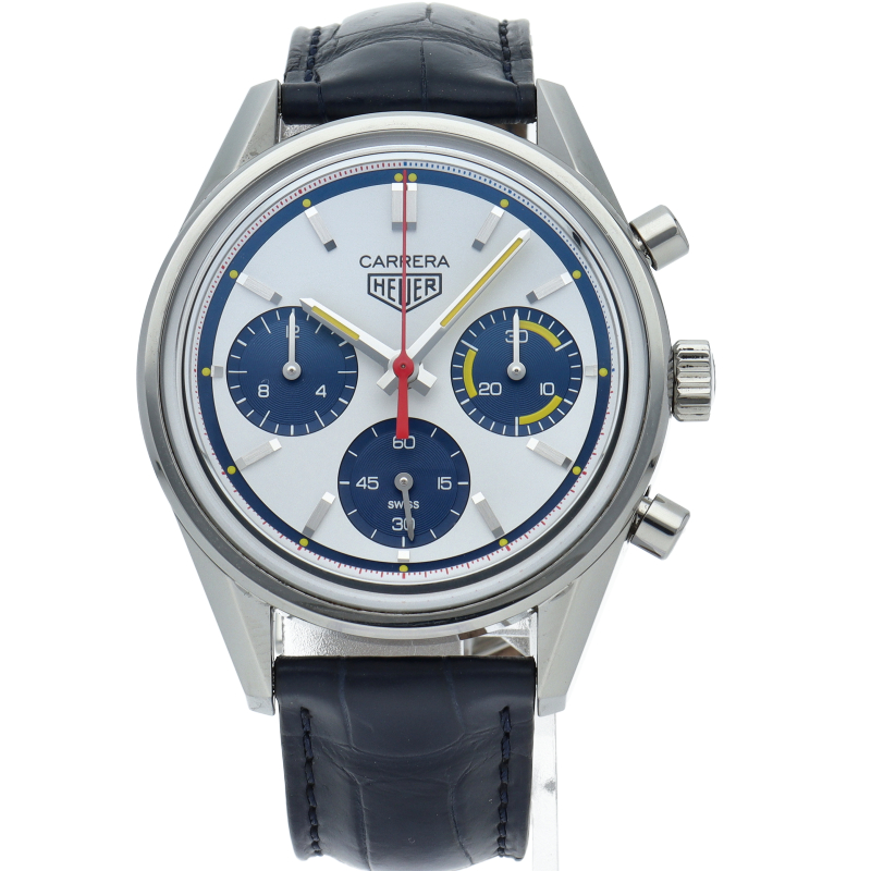この39mmの「タグ・ホイヤー カレラ 160周年 モントリオール リミテッドエディション」は、アズラージュ加工が施されたブルーの3つのカウンターとブルー&ホワイトのダイヤルが特徴です。 ドーム型サファイアクリスタルで保護されたダイヤルには、一目でわかる「Carrera」の名と「HEUER」のシールドロゴがプリントされ、レトロな見た目を演出します。