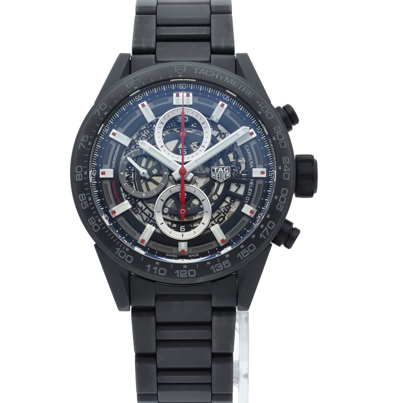 「カレラ キャリバーホイヤー01クロノグラフ」から2mmダウンサイジングした43mmケース。タキメーターベゼルには耐傷性に優れたブラックセラミックを採用し、文字盤をスケルトン仕様にすることでスポーティーでメカニックな印象のモデルです。ムーブメントにはブラックコーティングが施されたローターと赤色のコラムホイールが特徴のキャリバー「ホイヤー01」を搭載します。