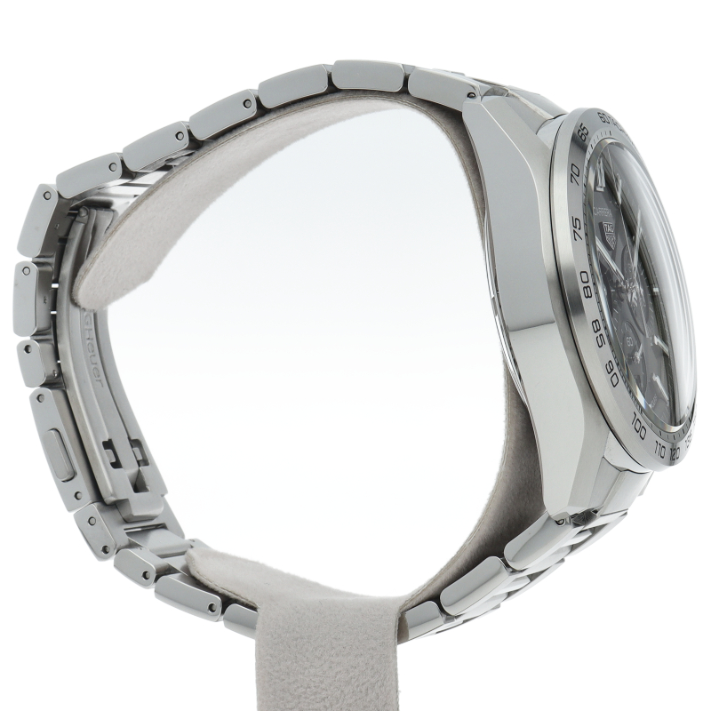モーターレーシングの伝統を物語る輝かしい栄光を纏ったタグ・ホイヤー カレラ クロノグラフ。 快適性を求めてラグを短くした44 mmのステンレススティール製ケースは、ポリッシュとサテン仕上げが相互に施され、時計をさらに薄くスマートに見せています。