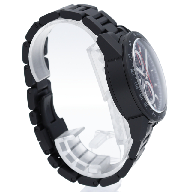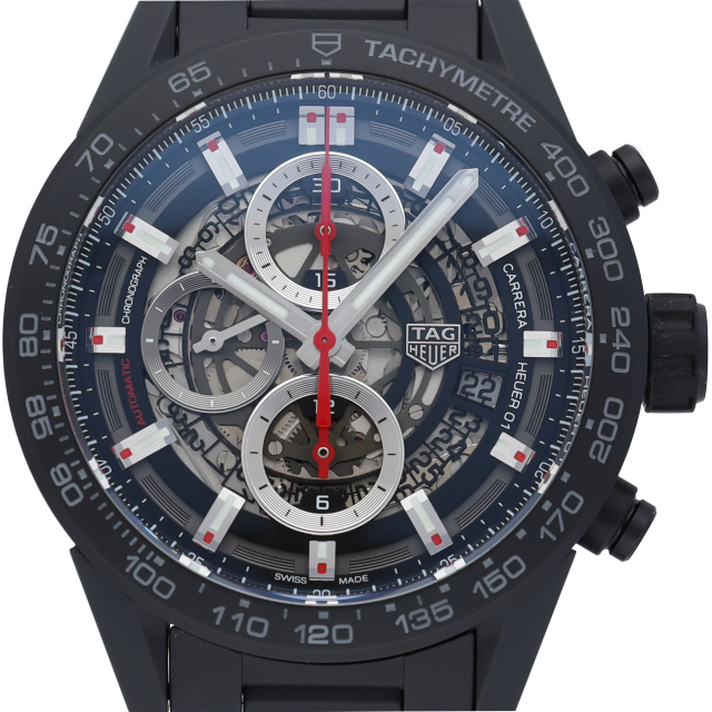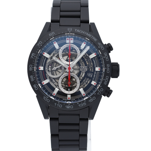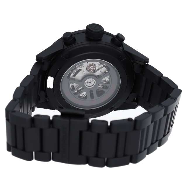 「カレラ キャリバーホイヤー01クロノグラフ」から2mmダウンサイジングした43mmケース。タキメーターベゼルには耐傷性に優れたブラックセラミックを採用し、文字盤をスケルトン仕様にすることでスポーティーでメカニックな印象のモデルです。ムーブメントにはブラックコーティングが施されたローターと赤色のコラムホイールが特徴のキャリバー「ホイヤー01」を搭載します。