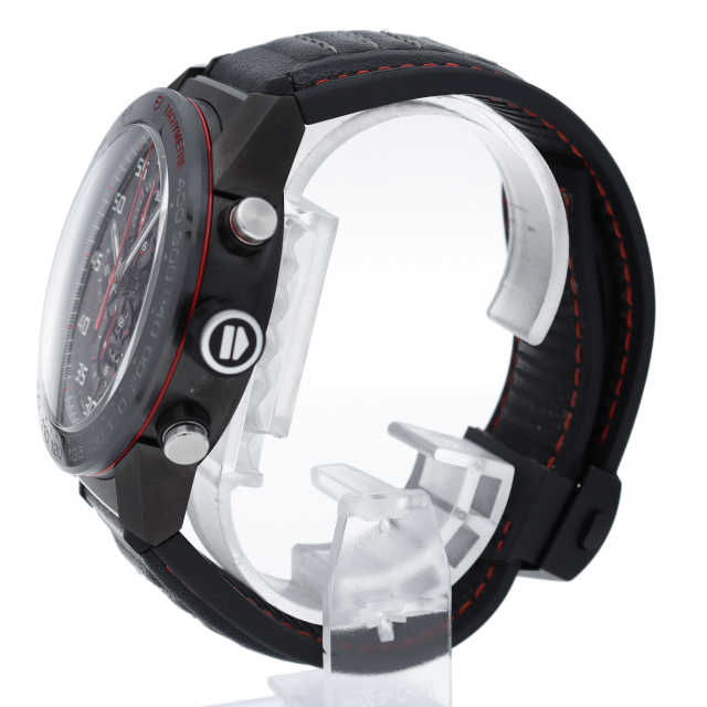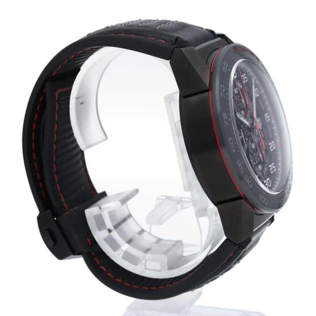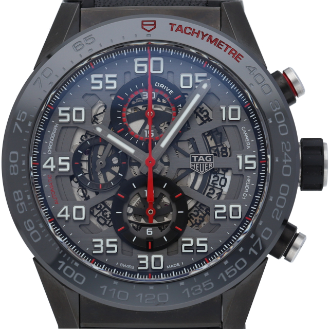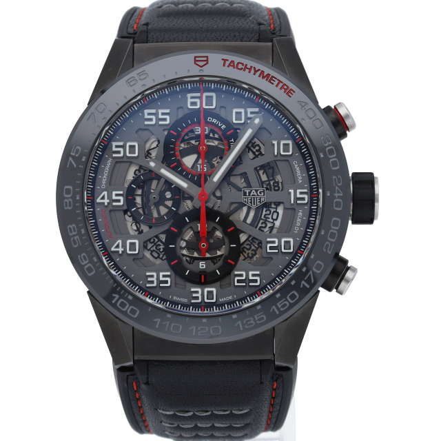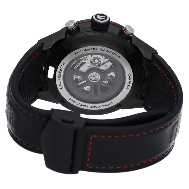 文字盤が全面オープンスタイルとなり、搭載されたタグ・ホイヤー自社製自動巻きクロノグラフ・ムーブメント・キャリバー ホイヤー01。ケースやベゼルには耐傷性に優れたブラックチタニウムカーバイドコーティングのステンレススティールを採用。スポーティーでメカニックな印象の1本です。