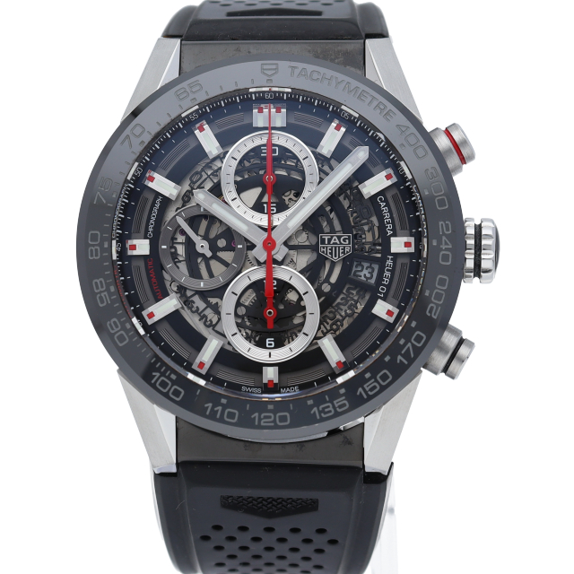 「カレラ キャリバーホイヤー01クロノグラフ」から2mmダウンサイジングした43mmケース。タキメーターベゼルには耐傷性に優れたブラックセラミックを採用し、文字盤をスケルトン仕様にすることでスポーティーでメカニックな印象のモデルです。ムーブメントにはブラックコーティングが施されたローターと赤色のコラムホイールが特徴のキャリバー「ホイヤー01」を搭載します。