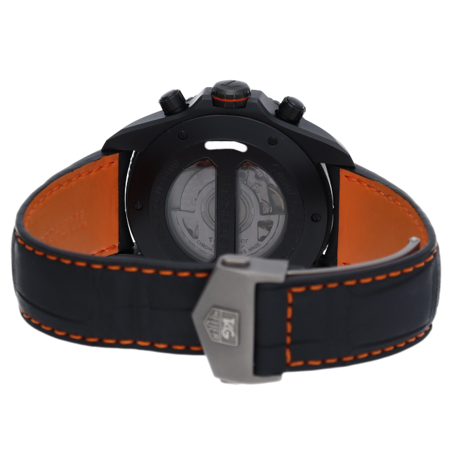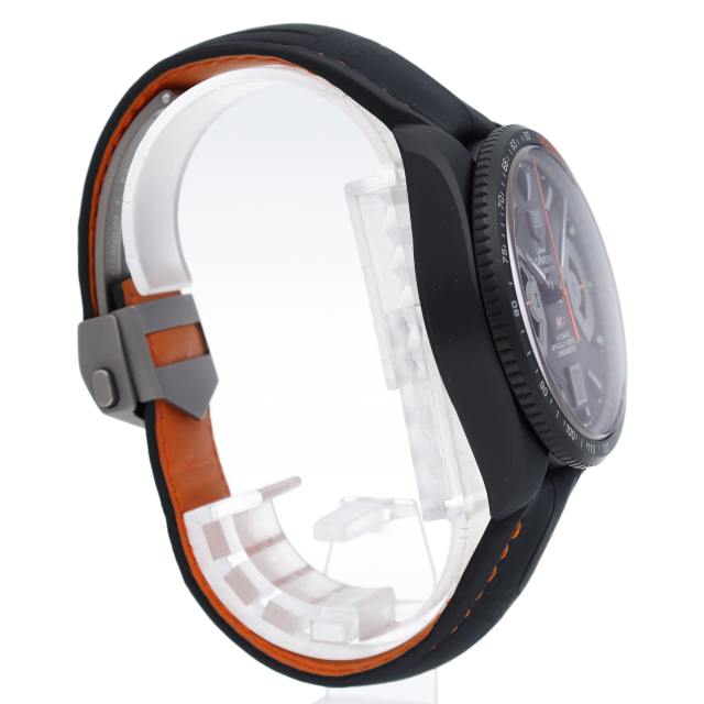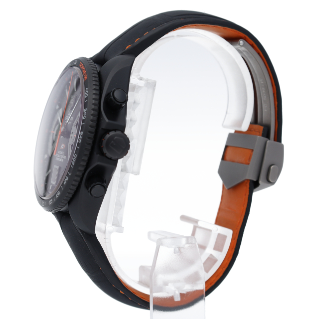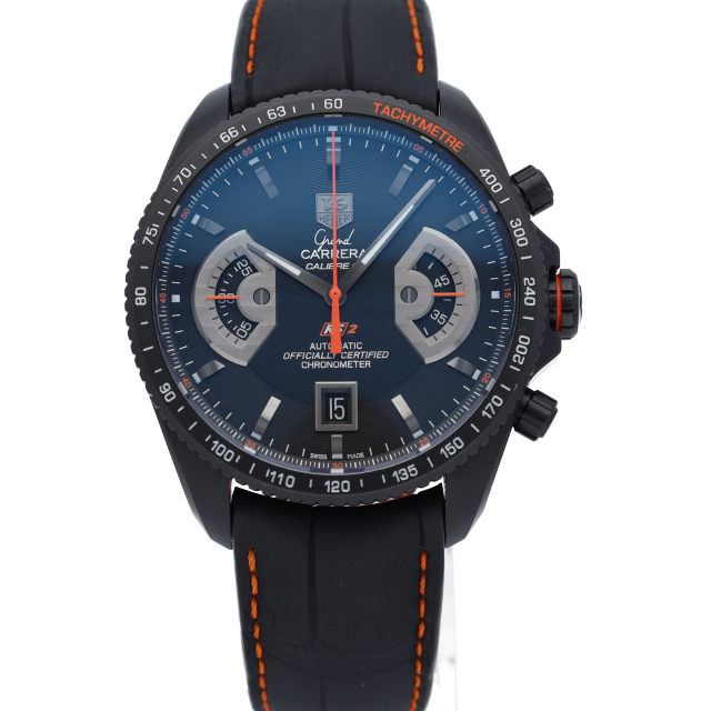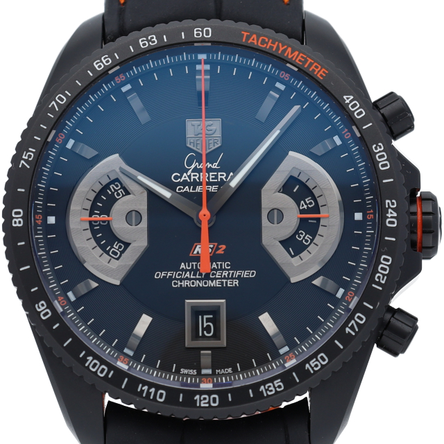タグホイヤーの上級人気モデル「グランドカレラ」。ディスク回転式のインダイアルを配置、デイト表示機能も搭載した機能性・デザイン性共に優れた1本。ブラックを基調としたデザインに、オレンジの差し色が、スポーティーな雰囲気を演出しています。